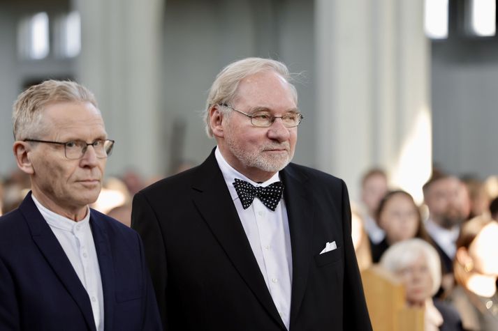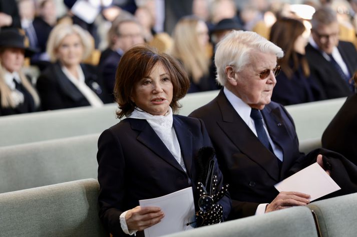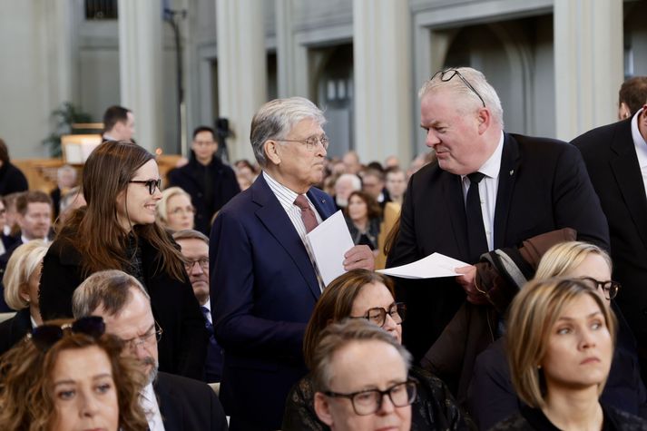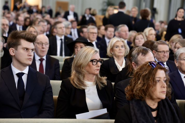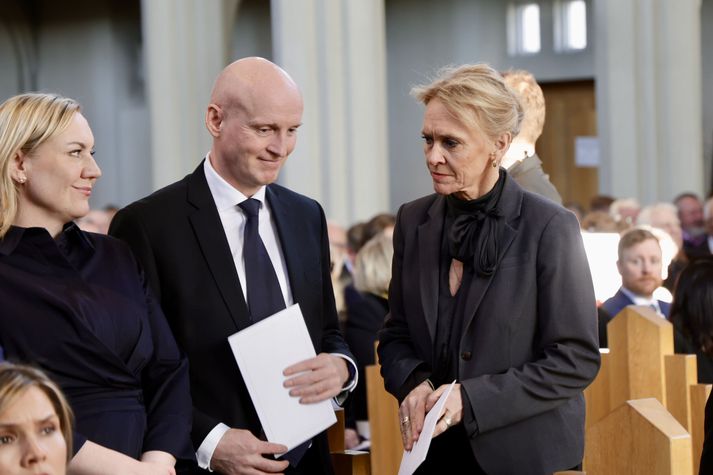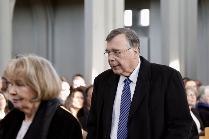 Kvöddu Davíð hinsta sinni Kolbeinn Tumi Daðason skrifar 13. mars 2026 14:39 Katrín Jakobsdóttir og Bjarni Benediktsson fallast í faðma en þau voru saman í ríkisstjórn frá 2017 til 2024. Ráðherrar og þingmenn, núverandi sem fyrrverandi, fjölmenntu í Hallgrímskirkju. Vísir/Vilhelm Forsetar, ráðherrar, Sjálfstæðismenn og samferðafólk Davíðs Oddsonar úr ýmsum áttum streymdu í Hallgrímskirkju í hádeginu til að votta honum virðingu sína. Forsætisráðherrann fyrrverandi var kvaddur með opinberri útför í Hallgrímskirkju. Ljósmyndari Vísis myndaði athöfnina. Síðasta opinbera útförin var þegar Halldór Ásgrímsson fyrrverandi forsætisráðherra var borinn til grafar 2015. Þá var opinber útför þegar Steingrímur Hermannsson fyrrverandi forsætisráðherra var kvaddur árið 2010. Opinberar útfarir voru tíðari á árum áður en virtir listamenn á borð við Kjarval og Laxness voru meðal þeirra sem hlutu opinbera útför. Séra Geir Waage gengur inn kirkjugólfið við upphaf athafnar.vísir/Vilhelm Séra Geir Waage stýrði athöfninni og flutti minningarorð um Davíð. Þar vitnaði hann meðal annars til sálma Davíðs úr Biblíunni. Kristinn Sigmundsson söng ásamt karlakórnum Fóstbræðrum og Sigurgeir Agnarsson lék Slá þú hjartans hörpustrengi eftir Bach á selló við upphaf athafnar. Í lok athafnar var lagið Ísland er land þitt flutt áður en Tómas Guðni Eggertsson organisti spilaði Við Reykjavíkurtjörn, lag Gunnars Þórðarsonar sem Davíð samdi textann við til Ástríðar konu sinnar. Ástríður Thorarensen eiginkona Davíðs og Þorsteinn Davíðsson sonur þeirra á fremsta bekk ásamt Heiðrúnu Geirsdóttur eiginkonu sinni og dætrum þeirra tveimur.Vísir/Vilhelm Vilhelm Gunnarsson ljósmyndari Vísis var með myndavélina á lofti og myndaði gesti og það sem fyrir augu bar. Sólin skein inn um háa glugga Hallgrímskirkju á meðan útför stóð.Vísir/Vilhelm Séra Geir Waage les upp úr guðspjallinu. Geir er tengdafaðir Þorsteins sonar Davíðs.Vísir/Vilhelm Karlakórinn Fóstbræður undir stjórn Árna Harðarsonar söng við útförina.vísir/Vilhelm Daði Már Kristófersson fjármálaráðherra.vísir/Vilhelm Líkmennirnir og vinir Davíðs þeir Haraldur Johannessen ritstjóri, Hannes Hólmsteinn Gissurarson prófessor í stjórnmálafræði, Þórólfur Gíslason kaupfélagsstjóri, Þórarinn Eldjárn skáld og Kjartan Gunnarsson fyrrverandi framkvæmdastjóri Sjálfstæðisflokksins sátu á fremsta bekk.Vísir/Vilhelm Bjarni Benediktsson var formaður Sjálfstæðisflokksins í sextán ár en Davíð í fjórtán. 27 ára seta Ólafs Thors í stóli formanns verður seint leikin eftir. Þóra Margrét Baldvinsdóttir eiginkona Bjarna var með í för í dag.Vísir/vilhelm Ólafur Ragnar fyrrverandi forseti ásamt Dorrit Moussaieff eiginkonu sinni.Vísir/Vilhelm Ólafur Börkur Þorvaldssson hæstaréttardómari og Ásgeir Jónsson seðlabankastjóri voru á meðal líkmanna.Vísir/Vilhelm Guðrún Karls Helgudóttir biskup Íslands fylgdist með Geir Waage stýra athöfninni.Vísir/Vilhelm Halla Tómasdóttir forseti og Björn Skúlason eiginmaður hennar. Kristrún Frostadóttir forsætisráðherra og Benedikt Bogason forseti Hæstaréttar voru með þeim á öðrum bekk en öll þrjú eru handhafar forsetavalds.Vísir/vilhelm Skjáir voru í kirkjunni til að auðvelda fólki að fylgjast með athöfninni.Vísir/Vilhelm Líkmennirnir tíu ganga inn í kirkjuna. Gunnlaugur Sævar Gunnlaugsson, Ólafur Börkur Þorvaldsson, Ásgeir Jónsson, Eiríkur Jónsson, Albert Jónsson, Haraldur Johannessen, Hannes Hólmsteinn Gissurarson, Þórólfur Gíslason, Þórarinn Eldjárn og Kjartan Gunnarsson.Vísir/Vilhelm Ráðherrar ríkisstjórnarinnar gáfu ekki kost á viðtölum eftir ríkisstjórnarfund í dag vegna skamms tíma á milli fundar og fram að útför. Hér eru Jóhann Páll Jóhannsson og Alma Möller.Vísir/Vilhelm Guðrún Hafsteinsdóttir formaður Sjálfstæðisflokksins virðir líkmennina Hannes Hólmstein, Þórólf Gíslason, Þórarinn Eldjárn og Kjartan Gunnarsson fyrir sér.Vísir/vilhelm Katrín Jakobsdóttir og Bjarni Benediktsson fallast í faðma en þau voru saman í ríkisstjórn frá 2017 til 2024. Vísir/Vilhelm Guðna Th. Jóhannessyni fyrrverandi forseta vísað til sætis.vísir/vilhelm Geir Haarde og Friðrik Sophusson takast í hendur. Inga Jóna Þórðardóttir eiginkona Geirs er til hægri.vísir/vilhelm Þorsteinn Pálsson og Sigurður Ingi Jóhannsson takast í hendur. Eitt af mörgum handaböndum Sjáflstæðismanns og Framsóknarmanns en flokkarnir hafa mannað marga ríkisstjórnina saman.vísir/vilhelm Séra Geir Waage gengur inn í kirkju og studdist við staf.vísir/vilhelm Þórarinn Eldjárn og Kjartan Gunnarsson voru góðir vinir Davíðs en allir þrír voru MR-ingar og höfðu gaman af bókum og listum.Vísir/Vilhelm Ráðherrarnir Eyjólfur Ármannsson og Þorbjörg Sigríður Gunnlaugsdóttir hleypa Þorgerði Katrínu Gunnarsdóttur félaga sínum úr ríkisstjórninni í sæti sitt.vísir/vilhelm Stórsöngvarinn Kristinn Sigmundsson söng við athöfnina.vísir/vilhelm Guðrún Bryndís Karlsdóttir biskup bent á hvar hún á að sitja.vísir/vilhelm Halla Tómasdóttir forseti Ísands mætir til athafnar svartklædd líkt og flestir gestir í dag.vísir/vilhelm Ásgeir Jónsson seðlabankastjóri var meðal líkmanna en Davíð var um tíma einn þriggja seðlabankastjóra landsins.Vísir/vilhelm Sigmundur Davíð Gunnlaugsson formaður Miðflokksins mætir ásamt Önnu Sigurlaugu Pálsdóttur eiginkonu sinni.Vísir/vilhelm Hannes Hólmsteinn Gissurarson hefur lýst Davíð Oddssyni sem sínum besta vini.Vísir/vilhelm Geir Haarde tók við formennsku í Sjálfstæðisflokknum af Davíð á sínum tíma. Þá var hann fjármálaráðherra í ríkisstjórn Davíðs.vísir/vilhelm Þorsteinn Davíðsson sonur Davíðs 