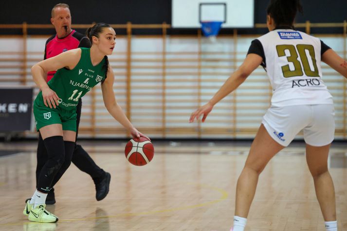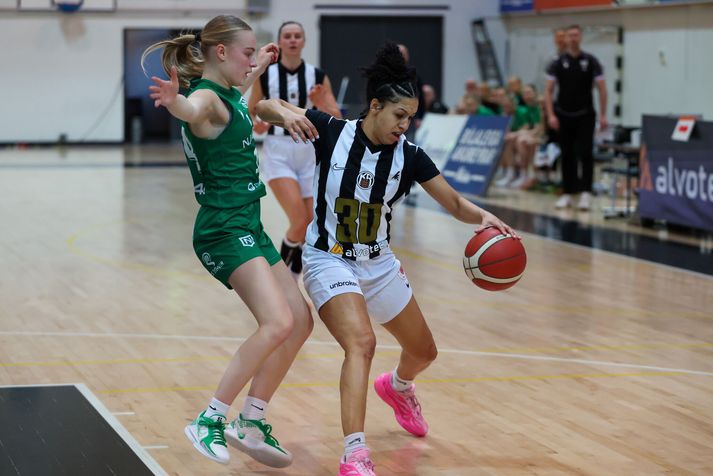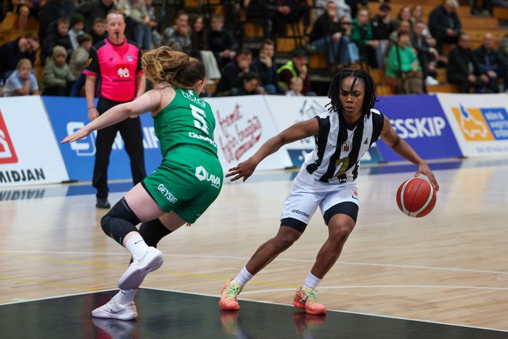 KR lagði Njarðvík að velli, 89-70, þegar liðin leiddu saman hesta sína í toppslag Bónus-deildar kvenna í körfubolta að Meistaravöllum í kvöld. Njarðvík var í toppsætinu fyrir leikinn sem var liður í næstsíðustu umferð deildarinnar. Njarðvík hóf leikinn betur og var hænufeti framar fyrstu tvo leikhlutana en staðan var 40-36 gestunum í vi þegar liðin gengu til búningsherbergja í hálfleik. Danielle Rodriguez fór fyrir sóknarleik Njarðvíkur. Vísir/Pawel Það var hins vegar kraftmikið KR-lið sem mætti til leiks inn í þriðja leikhlut og snéri taflinu sér í vil. KR vann þann leikhluta 30-13 en þar var það orkumikil og sterk vörn heimakvenna, sóknarfráköst og góð skontýting sem varð til þess að þær náðu upp þægilegu forskoti. KR-liðið leit aldrei til baka og hleypti Njarðvík ekki að neinu ráði inn í leikinn í fjórða leikhluta og niðurstaðan sannfærandi 19 stiga sigur KR sem getur þar af leiðandi tryggt sér deildarmeistaratitilinn þegar liðið etur kappi við Hauka í lokaumferð deildarkeppninnar. KR - Njarðvík Bónus deild kvenna Vetur 2026 Daníel: Allt önnur orka í liðinu í seinni hálfleik „Við fórum vel yfir málin í hálfleik og eftir flatan fyrri hálfleik var allt annað að sjá orkustigið hjá liðinu í seinni hállfeik. Við spiluðum mun betri vörn og náðum aðeins að hægja á Danielle Rodrigues. Það skilaði sér í meira sjálfstrausti á sóknarhelmingnum sem var lykillinn að sigrinu,“ Daníel Andri Halldórsson, þjálfari KR, sáttur að leik loknum. „Við vorum vel undirbúnar fyrir þennan leik en náðum ekki að framkvæma það sem við ætluðum okkur í fyrri hálfleik en það var allt annað uppi á teningnum í þeim seinni sem var frábært að sjá,“ sagði Daníel Andri enn fremur. „Þessi sigur setur okkur í þá stöðu að við getum tryggt okkur deildarmeistaratitilinn í lokaumferð deildarinnar sem er bara ansi vel gert þegar litið er til þess að við erum nýliðar í deildinni,“ sagði hann um framhaldið. „Nú förum við að búa okkur undir leikinn við Hauka. Við höfum stuttan tíma til þess að fagna þessum sigri og þurfum að fara að einbeita okkur að lokaumferð deildarinnar. Vonandi náum við að taka frammistöðuna í seinni hálfleiknum með okkur í þann leik,“ sagið Daníel um verkefni KR-liðsins í lokaumferðinni. Einar Árni: Margt sem fór úrskeiðis í seinni hálfleik „Við byrjuðum leikinn vel og vorum í fínum málum framan af leik. Það var hins vegar ansi margt sem fór úrskeiðis í seinni hálfleik og því fór sem fór,“ Einar Árni Jóhannsson, þjálfari Njarðvíkur, svekktur eftir leik. „Þær tóku mun fleiri sóknarfráköst en við þegar líða tók á leikinn og bara hittu ansi vel. Við náðum ekki að finna lausnir á varnarleiknum þeirra og það vantaði ansi margt til þess að við næðum að fara með sigur af hólmi,“ sagði Einar Árni enn fremur. „Það er hins vegar skammt stórra högga á milli og við eigum hörkuleik á miðvikudaginn þannig að það þýðir ekkert að dvelja of lengi við þetta tap. Það er engin óskastaða að það sé svona stutt á milli leikja þar sem við höfum ekki haft hópinn saman í tæpar þrjár vikur vegna landsliðsverkefna. Við breytum því samt ekkert og þurfum bara að undirbúa okkur eins vel og mögulegt er fyrir komandi leik,“ sagði hann um framhaldið hjá Njarðvíkurliðinu. Einar Árni Jóhannsson fer yfir málin með leikmönnum sínum. Vísir/Pawel Atvik leiksins Molly Kaiser, sem var stigahæst hjá KR-liðinu með 23 stig, setti tóninn fyrir það sem koma skyldi í þriðja leikhluta með því að skora fyrstu stig leikhlutans. KR-liðið lék við hvurn sinn fingur eftir það og frammistaða liðsins var til eftirbreytni. Danielle Rodriguez var fremst meðal jafnningja hjá Njarðvíkurliðinu en hún skoraði 26 stig í leiknum. Hulda María Agnarsdóttir byrjaði leikinn sterkt og skoraði alls 14 stig í leiknum. Jiselle Thomas spilaði vel á báðum endum vallarins. Vísir/Pawel Stjörnur og skúrkar Eins og áður segir dró Molly Kaiser vagninn í sóknarleik KR en Rebekka Rut Steingrímsdóttir og Jiselle Thomas fylgdu fast á hæla hennar með 20 stig hvor. Rebekka Rut reif auk þess niður átta fráköst og Jiselle Thomas sjö. Eve Braslis var einnig öflug undir körfunni hjá KR en hún tók níu fráköst. Hulda María Agnarsdóttir skilaði góðu framlagi fyrir Njarðvík. Vísir/Pawel Dómarar leiksins Dómarar leiksins, þeir Davið Kristján Hreiðarsson, Bjarni Hlíðkvist Kristmarsson og Sófus Máni Bender höfðu góð tök á þessum leik og fá sjö í einkunn fyrir prýðileg störf sín í kvöld. Dómaratríóið þeir Davið Kristján Hreiðarsson, Bjarni Hlíðkvist Kristmarsson og Sófus Máni BenderVísir/Pawel Stemming og umgjörð Það var frábær stemming á Meistaravöllum í kvöld en bæði lið fengu ríkulegan stuðing úr stúkunni. Leikurinn í kvöld var til styrktar Gigtarfélags Íslands og rennur andvirði miðasölu leiksins sem og sölu á vörum merktum félaginu til þessa góða málefnis. Vel gert KR-ingar. Molly Kaiser var í stuði hjá KR-liðinu. Vísir/Pawel