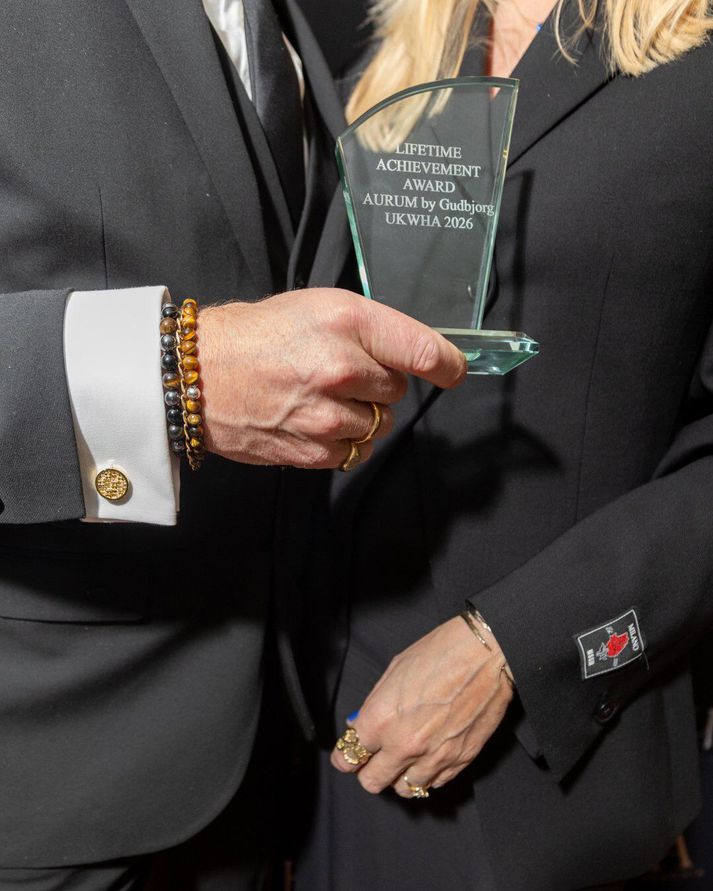 Búðin hefur fyrir löngu fest sig í sess sem ein virtasta skartgripaverslun Íslands en Aurum hlaut nýverið hin virtu ævistarfsverðlaun eða Lifetime Achievement Award 2026 í Bretlandi. Er þetta í fyrsta sinn sem íslenskt skartgripafyrirtæki hlýtur slík verðlaun. Verðlaunin voru hluti af bresku brúðkaups- og brúðkaupsferðar verðlaunum eða UK Wedding & Honeymoon Awards, sem haldin eru hátíðleg í London á ári hverju. Þau eru veitt einstaklingum og fyrirtækjum innan brúðkaups- og ferðageirans sem hafa skarað fram úr og lagt mikið af mörkum til listgreinarinnar. View this post on Instagram A post shared by Aurum by Guðbjörg (@aurumjewellery) Guðbjörg og eiginmaður hennar Karl Jóhann Jóhannsson fóru út með dætrum sínum þremur og voru þau í skýjunum með viðurkenninguna. Hjónin settu vörumerkið á laggirnar árið 1999 og hefur Guðbjörg hannað skart fyrir stórstjörnur á borð við Katy Perry. „Að hljóta þessi heiðursverðlaun er sérstaklega stór viðurkenning fyrir Aurum, sem hefur í áratugi lagt áherslu á vandað handverk, tímalausa hönnun og persónulega nálgun við viðskiptavini sína,“ segir Guðbjörg og bætir við: „Þessi viðurkenning er okkur afar dýrmæt og táknar mikla viðurkenningu á þeirri ástríðu og vinnu sem hefur verið lögð í Aurum í gegnum árin. Við höfum alltaf haft það að leiðarljósi að skapa skart sem hefur merkingu og endist kynslóðum. Að fá þessa viðurkenningu á alþjóðlegum vettvangi er bæði heiður og hvatning til að halda áfram á sömu braut.“ Glæsileg fjölskylda. Karlotta Kara Karlsdóttir, Karl Jóhann Jóhannsson, Ingibjörg Æsa, Guðbjörg Kr Ingvarsdóttir og Ásgerður Diljá Karlsdóttir.Aðsend Kvöldið var vægast sagt ógleymanlegt hjá fjölskyldunni. „Það var ótrúleg upplifun að fá að standa á sviðinu í London og taka við þessum verðlaunum. Fyrir okkur sem fjölskyldufyrirtæki er þetta ekki aðeins viðurkenning á starfi okkar heldur líka á öllum þeim viðskiptavinum sem hafa treyst okkur til þess að skapa skart fyrir sín stærstu augnablik,“ segir Guðbjörg að lokum. Verðlaunagripurinn.Aðsend Guðbjörg glæsileg á athöfninni.Aðsend