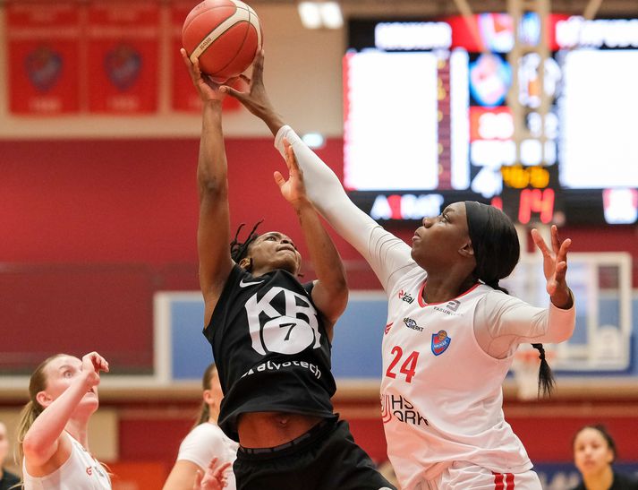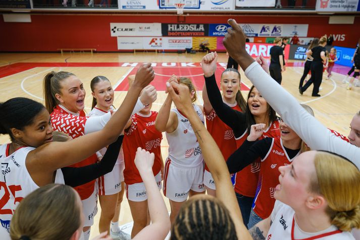 Ríkjandi Íslandsmeistarar Hauka vörðu deildarmeistaratitilinn í Bónus deild kvenna með 82-67 sigri gegn KR í úrslitaleik í lokaumferðinni. Haukar voru þarna að vinna sinn sjöunda deildarmeistaratitil og verða með heimavallarréttinn í úrslitakeppninni. Þær þekkja það frá því í fyrra hversu mikilvægur heimavallarrétturinn er en þá unnu þær Íslandsmeistaratitilinn í oddaleik. Haukakonur fagna titlinum.vísir / anton brink KR tókst aftur á móti ekki að verða fyrstu nýliðar sögunnar til að verða deildarmeistarar. Þær duttu niður í þriðja sæti deildarinnar því Njarðvík vann sinn leik. Þá er líka ljóst að Haukar munu mæta Stjörnunni og KR mun mæta Keflavík í fyrstu umferð úrslitakeppninnar. Skjálfti í upphafi en KR byrjaði betur Leikurinn bar þess greinileg merki að í honum væri mikið undir. Liðin byrjuðu bæði frekar illa, sýndu skjálfta í sóknarleiknum og skutu alveg skelfilega. Bæði lið 0 af 6 í þristum eftir fyrsta leikhluta. KR keyrði vel á Haukana í upphafi leiksvísir / anton brink KR tókst hins vegar að keyra vel á körfuna og Haukavörnina sem var ekki alveg vöknuð, en eftir leikhlé og smá skammir frá þjálfaranum varð varnarleikurinn skarpari. Haukarnir þurftu að hrista úr sér skjálftann í leikhléi. vísir / anton brink Sóknarleikur Hauka var hins vegar frekar einsleitur í upphafi og ef Amandine Toi eða Krystal Freeman sköpuðu sér ekki skot sjálfar þá virtist lítið gerast. KR var þannig með yfirhöndina í upphafi leiks. 17-20 forystu eftir fyrsta leikhluta og eftir að hafa loksins sett þriggja stiga skot stækkaði forystan í 22-26 í upphafi annars leikhluta. Allt í einu hrökk allt í gang hjá Haukum Haukarnir sættu sig ekki við stöðuna og spýttu skyndilega í lófana. KR komst lítið áleiðis í seinni hálfleik. Allt í einu hrökk bara allt í gang, vörnin varð betri, Amandine og Krystal voru samar við sóknarlega en aðrir leikmenn komust líka vel inn í leikinn. Þóra Kristín, sem hafði látið fara lítið fyrir sér, setti mikilvæg skot og staðan stóð 38-32 fyrir Haukum í hálfleik. Villuvandræði og meira vesen hjá KR Í upphafi seinni hálfleik jukust vandræði KR því Rebekka Rut og Jiselle Thomas, sem höfðu verið hvað öflugastar og stigahæstar hjá KR í fyrri hálfleik, fengu sínar þriðju villur og settust á bekkinn. Mikið mæddi þá á Molly Kaiser en hún komst ekki almennilega inn í leikinn. Haukar gengu á lagið Haukar nýttu heldur betur tækifærið og gjörsamlega kaffærðu KR í þriðja leikhlutanum. Leikurinn varð bara að einhverri Haukaveislu og það var vel við hæfi að afmælisbarnið Sólrún Inga setti þrjá þrista í röð til að loka stórkostlegum þriðja leikhluta hjá Haukum. Staðan þá 69-47 og vonir KR um að verða fyrstu nýliðar sögunnar til að vinna deildarmeistaratitilinn voru nánast horfnar. Eftir að hafa varla hitt úr skoti fyrir aftan línuna byrjaði KR allt í einu að hitta úr þristum í fjórða leikhluta. Þannig tókst að minnka muninn aðeins en Haukarnir héldu KR-ingum alltaf í hæfilegri fjarlægð. Sigur í höfn!vísir / anton brink Viðtöl eru væntanleg á Vísi.