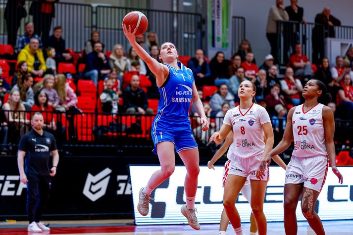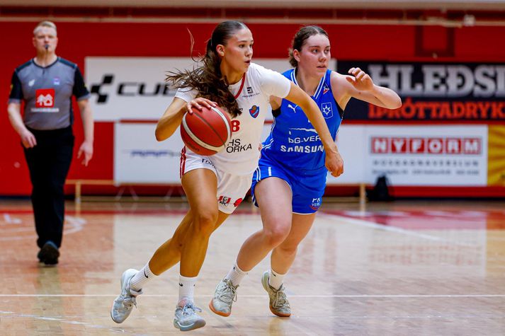 Uppgjörið: Haukar - Stjarnan 106-100 | Endurkoma Stjörnunnar dugði ekki til Sesselja Ósk Gunnarsdóttir skrifar 30. mars 2026 18:45 vísir/hulda margrét Deildarmeistararnir í Haukum höfðu betur gegn Stjörnunni 106-100, í fyrstu viðureign liðanna í úrslitakeppninni. Þrátt fyrir magnaðan 40 stiga þriðja leikhluta hjá Stjörnunni tókst liðinu ekki að snúa leiknum sér í vil. Leikurinn fór jafnt af stað og pressuðu Haukar stíft frá fyrstu mínútu. Stjörnukonum tókst þó að mestu að komast í gegnum hana í fyrsta leikhluta. Deildarmeistararnir leiddu með þremur stigum eftir fyrsta leikhlutann, 24-21. Tinna Guðrún Alexandersdóttir átti fínan leik fyrir Hauka.Hulda Margrét Stjarnan gaf ekkert eftir í byrjun annars leikhluta en þegar líða fór á gekk ekkert upp. Sex stig á sjö mínútum á meðan Haukar settu niður 22 stig. Sólrún Inga Gísladóttir kórónaði svo annan leikhluta með snyrtilegri þriggja stiga körfu á lokasekúndunum. Sólrún Inga setti niður mikilvæga þriggja stiga körfu þegar nokkrar sekúndur voru eftir af öðrum leikhluta.Hulda Margrét Þriðji leikhluti var hreint út sagt alveg ótrúlegur. Stjörnukonur komu vel gíraðar úr hálfleiknum og settu niður körfu eftir körfu. Stjarnan vann leikhlutann 40-29 og munaði ellefu stigum á liðunum fyrir fjórða leikhluta og því allt mögulegt fyrir bæði liðin. Diljá Ögn var frábær í liði Stjörnunar.Hulda Margrét Stjörnukonur gáfust ekki upp og börðust alveg til leiksloka. Það dugði þó ekki til en munurinn var sex stig þegar dómarar flautuðu til leiksloka. Haukar því með mikilvægan sigur fyrir næsta einvígi liðanna sem verður 3 apríl næstkomandi. Atvik leiksins Endurkoma Stjörnunar í þriðja leikhluta var frábær. Deildarmeistararnir fengu á sig 40 stig í leikhlutanum og leikurinn galopnaðist fyrir fjórða leikhlutann. Stjörnur og skúrkar Amandine Justine Toi var stigahæst með 28 stig fyrir Hauka, sex fráköst og fjórar stoðsendingar. Tinna Guðrún Alexandersdóttir kom þar næst með 21 stig og Krystal-Jade Freeman með 19 stig. Diljá Ögn Lárusdóttir var stigahæst hjá gestunum með 24 stig og Berglind Katla Hlynsdóttir kom þar næst með 22 stig. Stemning og umgjörð Lífleg stemning þrátt fyrir að stúkan hafi ekki verið full. Þessi meistari hefði getað verið einn í stúkunni og það hefði samt verið læti. Stemningsmaður.Hulda Margrét Dómarar Jóhannes Páll, Ingi Björn og Bjarni Rúnar stóðu vaktina á parketinu í kvöld. Fengu aðeins að heyra það svona eins og gengur og gerist en stóðu sig eins og hetjur. Dómarar kvöldsins ræða saman. Fengu að kíkja tvisvar í skjáinn.Hulda Margrét Bónus-deild kvenna Haukar Stjarnan
