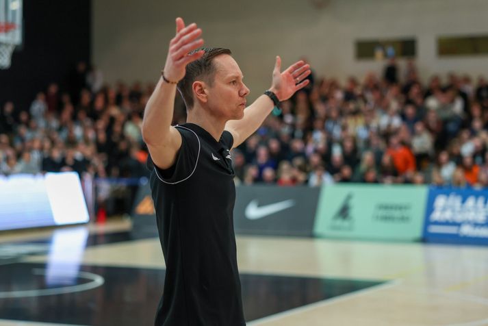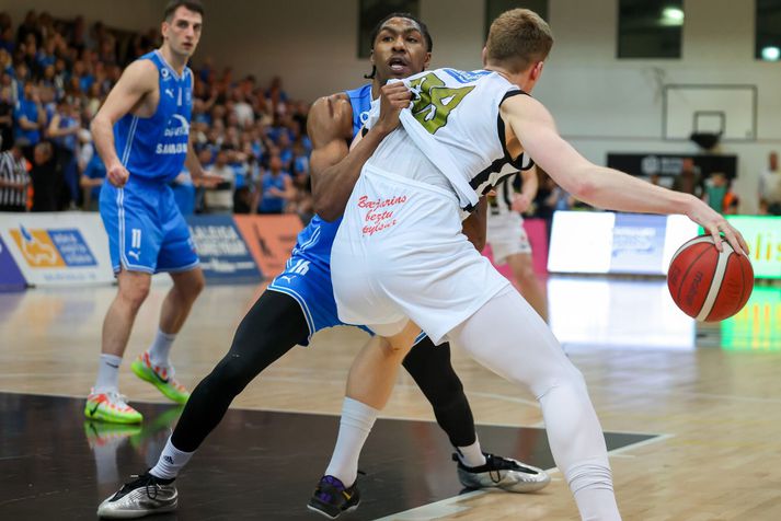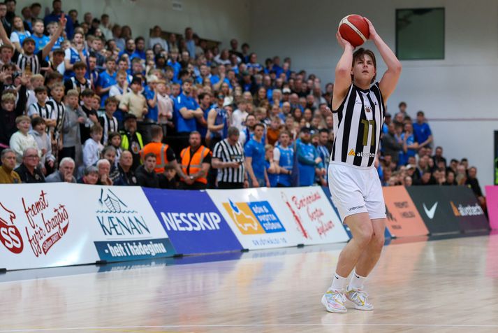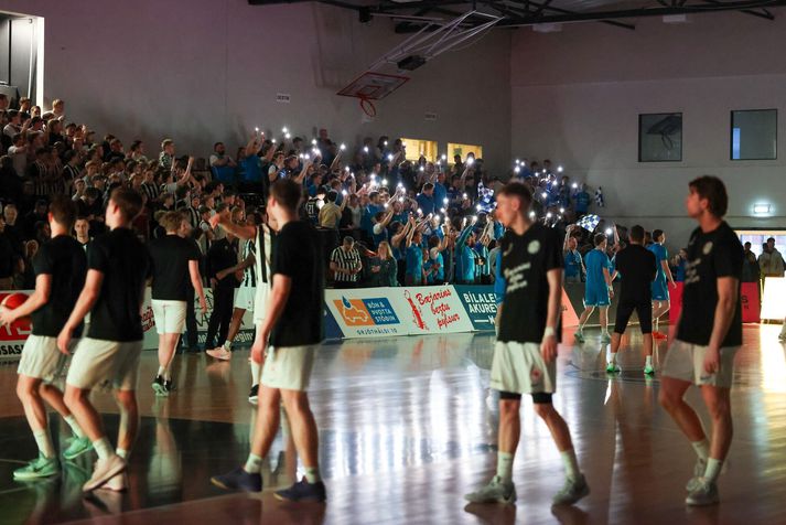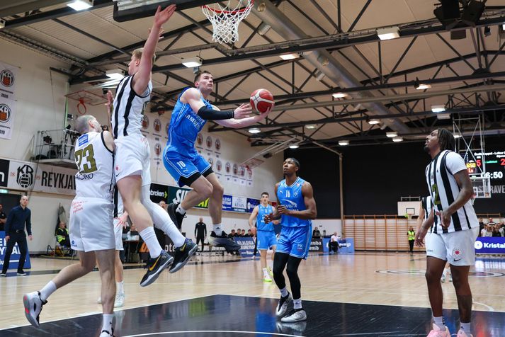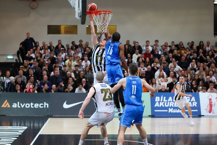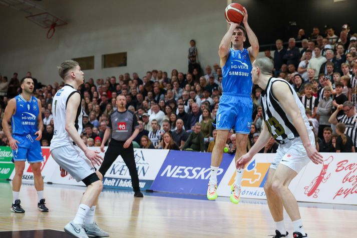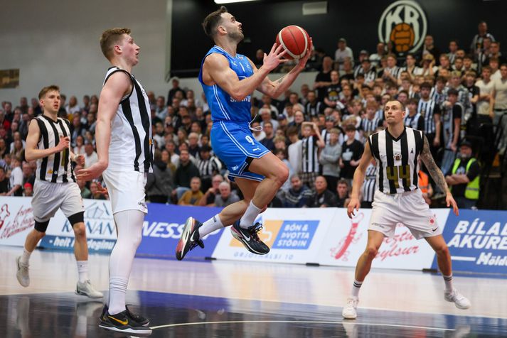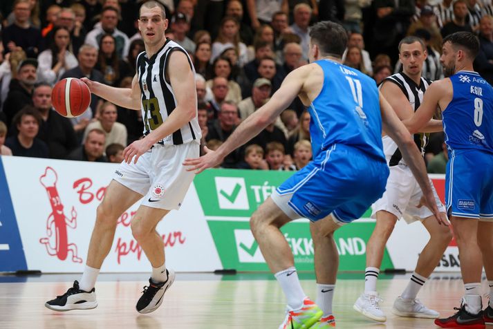 KR-ingar jöfnuðu einvígið við Stjörnuna í 1-1 í 8-liða úrslitum Bónus-deildar karla í körfubolta í kvöld. Liðin mætast að nýju í Garðabæ á föstudaginn en vinna þarf þrjá leiki til að komast í undanúrslitin. Lokatölur í Vesturbænum í kvöld urðu 91-82 en spennan var þó afar mikil nánast til loka. KR - Stjarnan Bónus deild karla vor 2026. Rafmagnin sló út rétt fyrir leik.Vísir / Diego Spennan var það mikil í byrjun að rafmagnið fór af salnum þegar flautan var við það að hringja til að gefa til kynna að leikurinn ætti að fara að byrja. Ástæðan fyrir því var að eldingu sló niður dreifikerfið rafmagns sem olli trufluninni á rafmagninu. Leikmenn fengu því auka 10 mínútur eða svo til að hita upp fyrir leikinn. KR komst yfir og hélt Stjörnunni fyrir aftan sig allan tímann. KR byrjaði leikinn heilt yfir betur, spilaði góða vörn og fékk nóg af körfum til að mynda níu stiga forskot þegar um þrjár mínútur voru eftir af fyrsta leikhluta. Stjarnan tók örlítið við sér þegar Pablo Bertone og Bjarni Guðmann komu inn á en KR náði að halda gestunum í skefjum og voru með sex stig forskot þegar fyrsti leikhlutinn kláraðist. KR - Stjarnan Bónus deild karla vor 2026. Friðrik Anton átti mjög góða innkomu.Vísir / Diego Annar leikhlutinn var svo mjög hraður og skipst á körfum á löngum köflum en heimamenn komust fyrr í takt varnarlega og náðu að koma í veg fyrir að gestirnir kæmust á sprett. Friðrik Anton Jónsson steig vel upp og skoraði sjö stig í leikhlutanum og hélt heimamönnum gangandi þegar fór að kólna sóknarmegin hjá KR. KR - Stjarnan Bónus deild karla vor 2026. Pablo Berton svífandi.Vísir / Diego Luka Gasic og Hilmar Smári gerðu þá vel í að setja niður stóra þrista til að halda KR í seilingarfjarlægð. Stjörnumenn voru búnir að ná að minnka muninn niður í fjögur stig þegar lítið var eftir af leikhlutanum en KR náði vopnum sínum í blálokin og þegar Þórir Guðmundur Þorbjarnarson negldi niður flautuþrist þá var forskotið komið aftur í níu stig þegar gengið var til búningsherbergja. Liðin skiptust á að skora í upphafi þriðja leikhluta en eftir um tvær mínútur þá náði KR að toga sig frá Stjörnunni. Aftur var varnarleikurinn góður og skotin fóru ofan í og sjálfstraust KR-inga í sókn var mikið. Komust þeir meðst 14 stigum yfir og hafði maður á tilfinningunni að Vesturbæingar væru að fara að sigla leiknum heim. Annað kom á daginn. Upp steig Luca Gasic. Hann skoraði sjö stig í röð en Stjörnumenn náðu ekki að grípa það tækifæri. Það hinsvegar gaf þeim þannig byr undir vængina að þeir lögðu ekki árar í bát.. KR - Stjarnan Bónus deild karla vor 2026. Giannis að komast að körfunni.Vísir / Diego Liðin kólnðu á sóknarhelmingnum og KR hélt því forystunni. Staðan var 70-59 eftir að Friðrik Anton boraði niður þrist. Þá var tekið leikhlé og Stjarnan sprakk út. Pablo Bertone og Ægir Þór réðust á KR-ingana af mikilli hörku og áður en við var litið þá var Stjarnan búin að jafna metin í 70-70 og lokamínúta þriðja leikhluta var farin af stað. Linards Jauntsems náði þá loksins að skora af vítalínunni og kom í veg fyrir að Stjarnan komst yfir og Þórir bætti við tveimur stigum og KR hélt forskotinu yfir leikhlutaskiptin, 73-70. Seth LeDay getur varið hringinn þegar hann nær að beita sér.Vísir / Diego KR byrjaði betur og komst í sjö stig forystu en Stjarnan var fljót að svara fyrir og minnkaði muninn í tvö stig. KR komst í fimm stiga forskot og Stjarnan jafnaði 80-80 en það virtist vera gesturnum úr Garðabæ lífsins ómögulegt að komast yfir en þeir fengu sannarlega tækifærin til þess. KR - Stjarnan Bónus deild karla vor 2026. Luka Gasic gerði vel í að koma sínum mönnum inn í leikinn aftur.Vísir / Diego Mikill hamagangur var í öskjunni og skoruðu liðin sitthvora körfuna og staðan var 82-82. Þá hættu Stjörnumenn að ná í körfur. Þeim gekk vel að koma í veg fyrir að KR skoraði af krafti en þar sem engar körfur komu á móti þá náðu þeir ekki að komast yfir hólinn. KR náði að gera þá vel að stoppa Stjörnuna af og með flautuþrist frá Toms þá lauk leiknum með níu stiga sigri 91-82 fyrir heimamenn. KR - Stjarnan Bónus deild karla vor 2026. Ægir að lofta boltanum yfir KR vörnina.Vísir / Diego KR er þar með búið að jafna metin í einvíginu og við fáum í það minnsta fjóra leiki í þessu einvígi. Næsti leikur á föstudaginn í Garðabænum. Atvik leiksins Í stöðunni 85-82 stal Tóti Túrbó boltanum og Þorvaldur Orri Árnason tvö stig úr hraðaupphlaupi en það voru hans einu stig. Þá var ekki búið að skora stig í dágóðan tíma og kláraði þetta nánast leikinn fyrir KR. Stjörnur og skúrkar Linards Junzems skoraði 31 stig fyrir KR og Þórir Guðmundur Þorbjarnarson bætti við 22 stigum og 13 stoðsendingum. Fengu KR framlag frá mörgum í dag en Toms Elvis Leimanis átti ekki góðan skotleik en hann hitti úr einu skoti af 11 og það kom alveg í blálokin. Linards átti stórleik.Vísir / Diego Hjá Stjörnunni var Pablo Bertone stigahæstur með 19 stig en Hilmar Smári kom næstur með 16 stig. Seth LeDay gat ekki beitt sér almennilega en hann fékk sína fjórðu villu í lok fyrri hálfleiks og þurfti því að sitja mikið og gat kannski ekki beitt sér eins mikið og hann gerir. Hann skoraði fjögur stig en venjulega skorar hann um 18 stig í leik. KR - Stjarnan Bónus deild karla vor 2026. Hilmar Smári var í villuvandræðum í kvöld en skoraði mjög velVísir / Diego Umgjörð og stemmning KR kann náttúrlega að halda leik í úrslitakeppni og hafa engu gleymt þó að fjögur ár séu liðin frá því að þeir voru hér síðast. Fleiri en 1200 áhorfendur létu svo vel í sér heyra og úr var