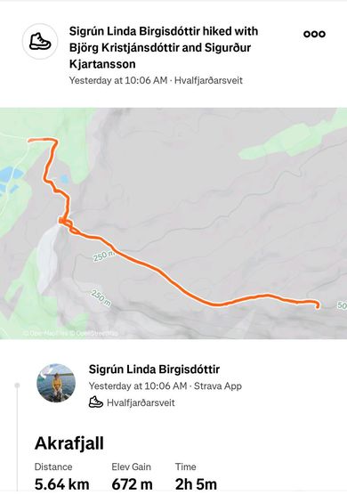 Veðurstofan varaði upp úr hádegi í gær við snjóflóðahættu á höfuðborgarsvæðinu eftir að tilyknningar bárust um slík. Veðurstofan mælti meðal annars gegn því við göngumenn á Esjunni að þeir gengu lengra en upp að Steini. Fyrr þann dag hafði Sigrún farið í fjögurra manna hópi upp á Akrafjall en göngugarparnir eru allir félagar í fjallgönguhópnum Toppförum. „Það var töluverður snjór. Þegar við vorum komin í fyrstu brekkuna er einn á undan mér, svo kem ég og svo önnur, og snjóflóðið tekur okkur tvær,“ segir Sigrún í samtali við Vísi. „Og við berumst bara niður með því. Bara rólega, kannski fimmtíu metra, og það fór kannski svona upp í mitti.“ Blessunarlega sakaði engan, að sögn Sigrúnar, en hún var með mannbrodda og gat því stöðvað sig. „Annars hefði ég líklegast farið lengra,“ segir hún. Gönguleiðin sem Sigrún fór.Aðsend „Það var enginn skaði skeður og ég var ekkert hrædd eða neitt. Svo bara dustuðum við af okkur og héldum upp aftur,“ bætir hún við. „En maður sá víðs vegar á þessum slóðum að það kann að vera varhugavert að fara um þessi svæði.“ Á leið sinni niður hafi gönguhópurinn svo varað þá sem þau mættu á leiðinni við snjóflóðahættunni. Sömuleiðis hafi hún sett inn færslu inn á Facebook-hópinn Snjóflóðatilkynningar. Sigrún er reyndur fjallagarpur en hefur aldrei lent í öðru eins. Hún hefur heldur ekki orðið vör við snjóflóð í Akrafjalli áður þrátt fyrir að hafa gengið þar áður. „Aldrei heyrt það, kannski einhverjir aðrir. Ég hef aldrei lent í þessu áður. Aldrei,“ segir hún. „En þetta er lífsreynsla út af fyrir sig.“