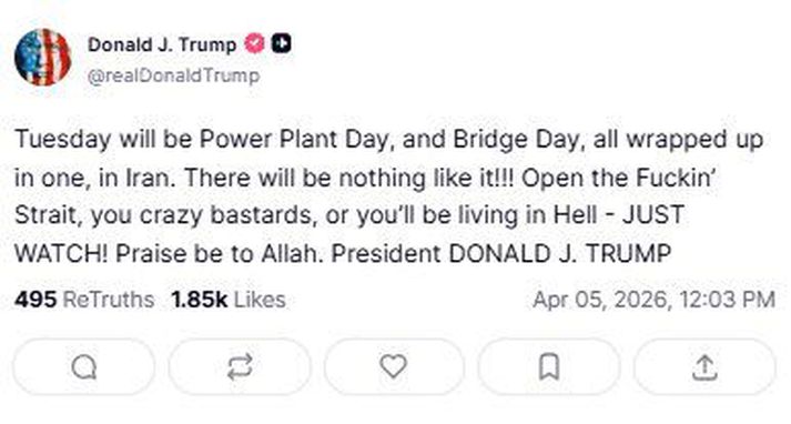„Bíðið bara! Dýrð sé Allah,“ bætir Trump við í færslu á samfélagsmiðlum þar sem hann boðar „virkjanadag“ og „brúardag“ í Íran á þriðjudag, en hann hefur hótað því að ráðast á orkuinnviði Írana ef þeir opna ekki Hormússund á ný, sem er ein helsta flutningsleið olíu í heimi. Færsla Trumps frá því í dag.Truth „Það verður engu líkt!!!“ skrifar hann. Í gær gaf Trump Írönum 48 klukkustunda frest til þess að opna sundið eða semja um frið, annars færi „allt til fjandans“ í Íran, þar sem stríð hefur geisað í rúman mánuð milli Bandaríkjanna og Ísrael annars vegar og Írana hins vegar. Frá því að Bandaríkjamenn og Ísraelsmenn hófu árásir á Írani í lok febrúar hafa Íranir hindrað umferð olíuskipa um sundið, sem hefur haft veruleg áhrif á olíuverð í heiminum. Íranski hershöfðinginn Ali Abdollahi Aliabadi gaf hótun Trumps lítinn gaum í gær og sagði hana bera merki um „ráðaleysi, taugaveiklun, óstöðugleika og heimsku“. Trump hefur hótað árásum þessu áður á síðustu mánuðum og framlengt þennan frest tvisvar. Hann framlengdi hann síðast um tíu daga þann 27. mars með vísan til þess að árangur hefði náðst í viðræðum milli Írana og Bandaríkjamanna. Færsluna birtir forsetinn skömmu eftir að Bandaríkjaher tókst að bjarga hermanni sem kastaði sér út úr herflugvél á föstudag, þegar vélin var skotin niður af írönskum hersveitum. Trump sagði þá að hermaðurinn væri heill á húfi, þó að hann hefði hlotið einhver sár.