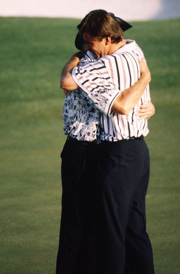 Þrjátíu ár eru liðin frá því að Norman hóf lokahringinn á Masters-mótinu með sex högga forskot á Faldo, helsta keppinaut hans. Norman átti martraðarhring, spilaði á sex höggum yfir pari og endaði fimm höggum á eftir Faldo sem vann sinn þriðja og síðasta græna jakka. Faldo faðmaði Norman eftir að þeir luku leik og sagði honum að „láta ekki bastarðana ná til þín“. Nú þremur áratugum síðar gefur Norman ekki mikið fyrir það vinaþel Faldo ef marka má viðtal við hann í breska blaðinu Telegraph í vikunni. „Það hafði ekki mikla þýðingu fyrir mér því ég vissi að hann yrði strax aftur eins og hann var áður. Við áttum aldrei í neinu raunverulegu sambandi. Við vorum algerar andstæður. Hann var einfari, ég gæti ekki verið eins og hann,“ sagði Norman í viðtalinu en hann gekk undir viðurnefninu „Hákarlinn“ á sínum tíma. Gagnrýnin á LIV orsökin Óvild Normans virðist þó helst skýrast af gagnrýni Faldo á LIV-mótaröðina sem Norman tók þátt í að stofna og stýrði þar til í fyrra. „Við áttum okkur sögu, hann hefði getað hringt í mig og beðið mig um mína hlið á málinu og ég hefði fúslega sagt henni hana. Ef hann hefði samt verið ósammála þá hefði það verið í fínu lagi og honum hefði verið frjálst að segja það sem hann vildi,“ sagði Norman sem var afar herskár sem yfirmaður LIV í garð PGA-mótaraðarinnar og eigenda risamótanna í golfi. Nick Faldo faðmar Norman eftir að hann tryggði sér sigurinn á Masters árið 1996. Faldo var þekktur fyrir að vera fáskiptinn en hughreysti þó keppinaut sinn eftir hræðilegan lokahring.Vísir/EPA Sárnaði Norman að Faldo hefði farið niðrandi orðum um LIV. „Eins og ég segi, ég ber enga virðingu fyrir honum. Hann kemur enn með hluti sem eru áhugavert heimskulegir ef ég á að vera hreinskilinn,“ sagði Norman. Elskar enn Augusta Norman brenndi margar brýr að baki sér þegar hann tók þátt í að koma LIV á koppinn og með framferði sínu þar. Athygli vakti að þegar honum var ekki boðið á Masters fyrir tveimur árum keypti hann sig inn og fylgdi Rory McIlroy, sem hann hefur munnhöggist við opinberlega, eftir. Reyndi hann ítrekað að ná athygli McIlroy sem veitti honum hana ekki. Þrátt fyrir bitra reynslu af grátlegum ósigrum á Masters, bæði árið 1996 og árið 1987 þegar hann tapaði í bráðabana eftir frægt vipp Larry Mize, segist Norman elska Masters-mótið og að hann ætli að horfa á það í sjónvarpi í ár. „Við vitum hverju þessar seinni níu geta kastað upp. Þær köstuðu upp Hvíta hárkalinum mikla sjálfum að minnsta kosti þrisvar. Ég elska staðinn þrátt fyrir allt það sem hefur gerst. Hlutirnir gerast bara þar.“