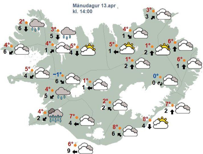 Smálægðir á sveimi og hvessir á morgun Atli Ísleifsson skrifar 13. apríl 2026 07:13 Hiti verður á bilinu einn til níu stig. Vísir/Vilhelm Smálægðir verða á sveimi kringum landið í dag og á morgun og má þá gera ráð fyrir fremur hægum austlægum vindum í flestum landshlutum og víða rigningu eða skúrum. Þó verður þurrt að mestu norðan jökla á morgun. Þetta kemur fram á vef Veðurstofunnar. Gera má ráð fyrir þremur til tíu metrum á sekúndu en norðaustan 10 til 18 metrum á Vestfjörðum fram eftir degi. Lægir þar síðdegis. Hiti verður á bilinu einn til níu stig, en frystir víða norðan- og austanlands undir kvöld. Á þriðjudagskvöld nálgast úrkomuskil landið úr suðri og verður vindur þar á bilinu 15-23 m/s aðfaranótt miðvikudags, hvassast í Öræfum. Fljótlega dregur úr vindi undir morgun. Útlit er fyrir talsvert mikla rigningu suðaustan- og austantil fram yfir hádegi, en síðdegis fer að létta til austanlands. Þegar skilin ganga yfir hlýnar heldur frá því sem áður var, með hita allt að 10 stigum í flestum landshlutum. Þetta hlýja loft virðist þó ætla að víkja fyrir heldur kaldara lofti sem færist yfir vesturhluta landsins seinnipart vikunnar. Þá munu hægar suðlægar, en úrkomulitlar, áttir ráða ríkjum. Spákort fyrir klukkan 14.Veðurstofan Veðurhorfur á landinu næstu daga Á þriðjudag: Suðaustlæg eða breytileg átt 3-10 m/s. Rigning eða slydda með köflum sunnan og suðaustantil en annars skýjað með köflum og þurrt að mestu. Austan 10-18 og rigning suðaustantil um kvöldið, hvassast syðst og í Öræfum. Hiti 2 til 10 stig. Á miðvikudag: Austlæg eða breytileg átt, víða kaldi eða stinningskaldi og rigning, en talsverð úrkoma suðaustan- og austanlands. Lægir síðdegis og dregur úr úrkomu. Hiti 2 til 10 stig. Á fimmtudag: Sunnan 3-10 og rigning með köflum en yfirleitt bjart með köflum á Norður- og Suðausturlandi.Hiti 2 til 9 stig. Á föstudag: Hæg suðlæg átt og smáskúrir sunnan- og vestanlands, en annars bjart með köflum. Hiti 2 til 7 stig. Á laugardag: Útlit fyrir fremur hæga suðlæga átt og rigningu, en þurrt að mestu norðaustanlands. Hiti breytist lítið. Á sunnudag: Útlit fyrir fremur hæga norðlæga eða breytilega átt og skýjað með köflum. Hiti breytist lítið. Veður Mest lesið Biður strengjabrúður Orbáns um að segja af sér Erlent Trump hjólar í páfa Erlent Ekur niður göngugötu og furðar sig á stæðaleysi Innlent Olíuverð hækkar enn meir í ljósi hótana Trumps Erlent Lágflugið vekur athygli erlendis Innlent Fangaverðir segja fangelsiskerfið „algjörlega komið að þolmörkum“ Innlent Orbán játar sig sigraðan Erlent Fjögur hundruð mál séu brýnni en þessi „gargandi vitleysa“ Innlent Lundinn sestur upp í Hafnarhólma Innlent Faðir Mary drottningar látinn Erlent Fleiri fréttir Smálægðir á sveimi og hvessir á morgun Hviður þvert á Vesturlandsveg á Kjalarnesi Oftar en ekki viðvörun í gildi í mars Má búast við mikilli úrkomu á Austfjörðum Útlit fyrir vorveður á næstu dögum Minnkandi vindur og stöku él Víða skúrir og hvessir eftir hádegi Allhvass vindur og rigning Önnur lægð nálgast landið Fylgstu með óveðrinu ganga yfir Vaktin: Austanbylur annan í páskum Loka Holtavörðuheiði í hádeginu og um Suðurlandið strax í fyrramálið Viðvaranirnar appelsínugular og hviður yfir 40 metrum á sekúndu Logn í dag á undan storminum á morgun Mæla með að fólk leggi fyrr af stað Gul viðvörun vegna austan stórhríðar annan í páskum Þungfært víða um land Kalt í veðri miðað við árstíma Snjóflóð skammt frá borginni líklega af mannavöldum Þungbúið fyrir norðaustan en heiðskírt víða annars staðar Gular viðvaranir taka gildi í enn eitt skiptið Gular viðvaranir vegna storms í kvöld og á morgun Hæðarhryggur yfir landinu í dag og stormur í nótt Lægð með snjókomu fer hratt yfir landið Snýst í austan og suðaustan í kvöld með snjókomu og slyddu Slydduél og snjókoma í kortunum Gular veðurviðvaranir í kortunum Gul viðvörun á höfuðborgarsvæðinu á morgun Lægðin heldur áfram að angra landsmenn Skólahaldi ekki aflýst en raskanir boðaðar Sjá meira