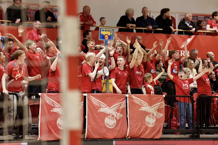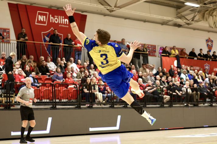 Uppgjörið: Valur - KA 38-34| Valsmenn sópuðu KA í sumarfrí Sesselja Ósk Gunnarsdóttir skrifar 13. apríl 2026 18:15 Gunnar Róbertsson átti nokkur góð mörk í dag. Vilhelm Gunnarsson Valsmenn sópuðu KA í sumarfrí eftir 38-34 sigur á Hlíðarenda í dag. Sigurinn var sá þriðji í einvíginu og tryggði Valur sér því sæti í úrslitaeinvíginu. Leikurinn byrjaði af krafti og leiddu KA menn með fjórum mörkum gegn einu eftir fimm mínútna leik. Valsmönnum tókst þá að skora fjögur mörk í röð gegn engu og tóku forystuna. Jafn kafli tók þá við þar sem liðin skiptust á að taka forystuna. Öflugur kafli hjá Valsmönnum kom þá þegar Björgvin Páll Gústavsson varði vel og tókst Valsmönnum að ná forystunni aftur. 19-15 og þannig stóðu leikar í hálfleik. Valsmenn juku forystu sína enn frekar í byrjun síðari hálfleiks og tókst að komast í sex marka forystu. KA menn gerðu vel og náðu að minnka muninn niður í tvö mörk. Það varði stutt en Valsmenn misstígu sig aldrei á meðan KA menn töpuðu boltanum og náðu ekki að nýta sóknirnar sínar. Valsmenn juku þá forskot sig enn og aftur og sigraði með fjórum mörkum 38-34. Atvik leiksins Verður að teljast í tvö skipti þegar KA menn reyndu að verjast mörkunum sem Björgvin Páll Gústavsson skoraði úr eigin teig. Allt reynt til þess að fara ekki í snemmbúið sumarfrí.Vilhelm Gunnarsson Stjörnur og skúrkar Þorgils Jón Svölu Baldursson var öflugur á línunni hjá Valsmönnum og skoraði sjö mörk. Þorgils öflugur í kvöld.Vilhelm Gunnarsson Andri Finnsson var þá með átta mörk og Arnór Snær Gíslason með sex mörk. Bjarni Ófeigur Valdimarsson var þá atkvæðamestur hjá gestunum með tíu mörk. Stemning og umgjörð Það var stemning Valsmegin í stúkunni allavega. Endastöðin hjá KA-mönnum.Vilhelm Gunnarsson Dómarar Það var kvartað og kveinað yfir dómgæslunni í kvöld enda mikið undir. Heilt yfir fín dómgæsla og fá góða sjöu frá mér. Olís-deild karla Valur KA