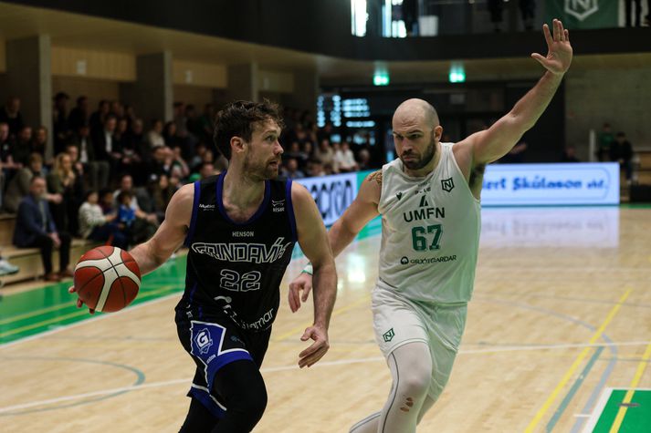 Uppgjörið: Njarðvík-Grindavík 84-91 | Grindvíkingar í undanúrslit Stefán Marteinn Ólafsson skrifar 14. apríl 2026 21:55 Deandre Donte Kane í leiknum í kvöld en Njarðvíkingurinn Veigar Páll Alexandersson er til varnar. Vísir/Guðmundur Þórlaugarson Deildarmeistarar Grindavíkur tryggðu sér sæti í undanúrslitum Bónusdeildar karla í körfubolta eftir sjö stiga sigur á Njarðvík í kvöld, 91-84. Grindavík tapaði fyrsta leik í einvíginu en svaraði með þremur sigrum í röð og vann því seríuna 3-1. Njarðvík var ellefu stigum yfir eftir fyrsta leikhlutann en Grindavík var skrefinu á undan eftir frábæran annan leikhluta. Spennan var í leiknum til loka en Grindvíkingar héldu út og lönduðu sigri. Njarðvík-Grindavík Bónus deild karla 2026Guðmundur/Vísir Leikurinn fór nokkuð fjörlega af stað og byrjuðu heimamenn virkilega sterkt og settu stór skot strax í byrjun og byrjuðu að safna ágætis forskoti. Njarðvík var með full tök á leiknum eftir fyrsta leikhluta og leiddi nokkið sannfærandi og sanngjarnt 28-17. Dwayne Lautier og Jeremy Pargo í baráttunni í kvöldGuðmundur/Vísir Það færðist meiri hiti í leikana í öðrum leikhluta og Grindvíkingar sem virkuðu vankaðir eftir frábæra byrjun Njarðvíkinga í fyrsta leikhluta byrjuðu að taka við sér og setja góð skot niður. Það færðist örlítill skjálfti í lið Njarðvíkinga sem fóru að taka slæmar ákvarðanir og Grindavík fór að refsa. Ólafur Ólafsson setti stór skot undir lok leikhlutans og náði í forystuna fyrir Grindavík þegar nokkrar sekúndur voru eftir að fyrri hálfleik og Grindavík leiddi í hálfleik 43-45. Kristófer Breki á stórar körfur í kvöld.Guðmundur/Vísir Njarðvíkingar komu með krafti út í seinni hálfleikinn og sóttu forystuna aftur. Heimamenn náðu þó aldrei að slíta sig frá Grindvíkingum sem eltu þá eins og skugginn og þegar leið á leikhlutann náði Grindavík í forystuna aftur. Eftir þriðja leikhluta var Grindavík með fjögurra stiga forystu 64-68. Daniel Mortensen og Dominykas Milka í baráttunni í kvöld.Guðmundur/Vísir Eins og við var að búast var mikil spenna í fjórða leikhluta. Bæði lið virkuðu svolítið stressuð fyrstu um sinn og hrædd við að gera mistök. Sóknarleikurinn varð staðari og skotin örlítið brothættari. Jeremy Pargo steig upp og hristi vel upp í þessu í fjórða leikhluta og kom Grindavík í þægilega stöðu með stórum körfum. Þetta gaf Grindavík það andrými sem þeir þurftu til þess að á endanum landa frábærum sjö stiga sigri 84-91 og um leið tryggja Grindavík sigur í seríunni 3-1. Atvik leiksins Jeremy Pargo tekur yfir leikinn í fjórða leikhluta þegar hann setur stór stig og kemur Grindavík í þægilega stöðu eftir að hafa verið í fremur jöfnum leik. Stjörnur og skúrkarJordan Semple var öflugur í liði Grindavíkur og hann var stigahæstur í kvöld með 23 stig. Jeremy Pargo var að setja erfið skot og hann var eins og Rúnar Ingi þjálfari Njarðvíkur lýsti eftir leik „endakall“ sem Njarðvík komst ekki í gegnum. Hann endaði með 19 stig í kvöld.Hjá Njarðvík var Dominykas Milka með tvöfalda tvennu, 16 stig og 15 fráköst.Dómaratríóið í kvöldGuðmundur/VísirDómararnirBjarki Þór, Jóhannes Páll og Jón Þór sáu um flautuna í IceMar-höllinni í kvöld. Þetta var ekki þeirra besta frammistaða og virkaði þetta svolítið sem aðeins of stór biti fyrir tríóið í kvöld. Mikill hiti og mikið undir og línan var alls ekki skýr í kvöld.Stuðningsmenn Grindavíkur í kvöldGuðmundur/VísirStemingin og umgjörðStemningin í Njarðvík var tryllt og allt það sem við viljum fá í úrslitakeppni. Báðar stuðningsmannasveitir fá stórt hrós fyrir að gera þetta að frábærri upplifun!Stuðningsmenn Njarðvíkur í kvöldGuðmundur/VísirViðtölJóhann Þór Ólafsson fer yfir málin með sínu liði í kvöld.Guðmundur/Vísir„Fáum ágætis tíma núna til þess að stilla saman strengi upp á nýtt“„Varnarlega fannst mér við vera bara nokkuð þéttir og gera þeim erfitt fyrir lengst af“ sagði Jóhann Þór Ólafsson þjálfari Grindavíkur eftir sigurinn í kvöld.„Fyrsta tilfinning er bara sú að við hittum úr stóru skotunum og þeir ekki. Það að leiðandi lendir þetta okkar meginn og við gerum vel í því. Það er svona fyrsta tilfinning strax eftir leik“Njarðvík byrjaði virkilega vel og það var mikilvægt að halda haus.„Við töluðum um það að vilja halda okkur í mómentinu og einbeita okkur bara af einni sókn í einu. Við höfum svolítið strögglað með það í gegnum þessa seríu og það er ekkert leyndarmál“„Það tókst ágætlega í kvöld og við vorum góðir í vörn sem hélt í öðrum leikhluta en svo var þetta bara stál í stál og við gerum vel að sigla þessu yfir línuna“Jóhann Þór gerði seríuna við Njarðvík upp eftir leik.„Njarðvíkingar gera bara mjög vel og sérstaklega komu okkur á óvart varnarlega eða á óvart ekki óvart, við bara leysum það illa fyrstu tvo og hálfan leikinn“„Við gerðum ágætlega í kvöld og bara hrós á þá fyrir að gera mjög vel og eins og ég hef sagt áður í viðtölum eftir þessa leiki að við þurfum að vera betur smurðir sóknarlega og ákvarðanartökur oft furðulegar og við þurfum að fara vel yfir það fyrir næstu seríu“„Við fáum ágætis tíma núna til þess að stilla saman strengi upp á nýtt og gera okkur klára fyrir það stríð“ sagði Jóhann Þór Ólafsson.Rúnar Ingi Erlingsson þjálfari Njarðvíkur ræðir málin við sitt lið í kvöld.Guðmundur/Vísir„Ég er núna bara byrjaður að undirbúa næsta tímabil“„Vonbrigði, það er bara svoleiðis“ sagði Rúnar Ingi Erlingsson svekktur eftir tapið í kvöld.„Við komum mjög flottir inn í leikinn. Mér fanns