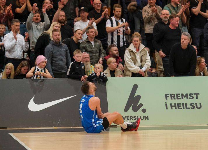 Stjörnumenn eru komnir áfram í undanúrslit Bónus-deildar karla í körfubolta eftir þriggja stiga sigur á KR í rosalegum fjórða leik liðanna á Meistaravöllum í Vesturbænum í kvöld. Úrslitin réðust ekki fyrr en eftir tvær framlengingar og leikurinn var vægast sagt viðburðarríkur. Stjarnan fór að lokum með 118-115 sigur af hólmi en staðan var 92-92 eftir venjulegan leiktíma og 105-105 eftir fyrri framlengingu. Stjörnumenn urðu fyrir gríðarlegu áfalli þegar fyrirliði þeirra Ægir Þór Steinarsson fór af velli illa meiddur á olnboga í þriðja leikhluta. Ægir Þór Steinarsson situr hér sárþjáður á vellinum. Vísir/Anton Brink Þegar Ægir Þór meiddist var staðan 75-60 Stjörnunni í vil og KR með pálmann í höndunum. Stjörnuliðið gafst hins vegar ekki upp þó síður sé. Gestirnir unnur upp forskot KR-inga og komu leiknum í framlengingu. KR-ingar voru í frábærri stöðu til að tryggja sér sigurinn í framlengingununum og þar með oddaleik en Garðbæingar sýndu magnaðan karakter og tókst að landa sigri. Baldur Þór Ragnarsson er kominn í undanúrslit með Stjörnuliðið.Vísir/Anton Brink Baldur Þór: Frábær sigur í krefjandi aðstæðum „Þetta var bara ótrúlegur körfuboltaleikur og ég er ofboðslega ánægður með að hafa landað sigri. Hér mættust tvö frábær körfuboltalið og leikurinn var fram og til baka allan leikinn,“ sagði Baldur Þór Ragnarsson, þjálfari Stjörnunnar. „Það voru krefjandi aðstæður að vera undir og missa Ægi Þór í þessi hrikalegu meiðsli. Það er hins vegar oft í íþróttum að svona móment geta hvatt þig til dáða. Við brugumst frábærlega við þessu mótlæti og ég er gríðarlega stoltur af leikmönnum mínum,“ sagði Baldur Þór enn fremur. „Eins og ég segi þá voru þetta bara tvö körfuboltalið í hæsta gæðaflokki að mætast og leikurinn var jafn eins og í raun bara allar viðureignir liðanna í vetur. Það er erfitt að segja eitthvað eitt frekar en annað hafi skilað þessu. Við erum bara fyrst og fremst ánægður að vera komnir í undanúrslit eftir þessa rússibanareið,“ sagði hann. Jakob Örn: Gríðarlega svekktur en á sama tíma stoltur „Svekkelsið er gríðarlegt að hafa ekki náð að klára þennan leik með sigri. Við náðum undirtökunum aftur og aftur en náðum ekki að slíta þá almennilega frá okkur. Það kemur svo slæmur kafli í þriðja leikhluta sem gerir þetta að leik og undir lokin náðum við ekki að tryggja okkur sigurinn sem við ætluðum okkur,“ sagði Jakob Örn Sigurðarson, þjálfari KR. „Það má segja að það sé slæm byrjun og dræm stigasöfnun á fyrri hluta tímabilsins sem setur okkur í þá stöðu að vera að spila við frábært lið Stjörnunnar á þessum tímapunkti í úrslitakeppninna. Að mínu mati hefði þessi sería átt að vera í undanúrslitum eða úrslitum en við lærum af því á næsta tímabili að freista þess að vera stöðugri í lengri tíma í deildarkeppninni,“ sagði Jakob Örn þar að auki. „Heilt yfir er ég svona þokkalega sáttur við leiktíðina. Það er auðvitað vonbrigði að fara ekki lengra í úrslitakeppninni þar sem við ætluðum okkur klárlega að fara alla leið. Liðið hefur hins vegar þroskast helling og fullt af jákvæðum hlutum sem við getum tekið með okkur inn í næsta tímabil svona þegar við jöfnum okkur á þessu svekkelsi,“ sagði Jakob en KR varð bikarmeistari undir hans stjórn fyrr á þessu tímabili. Jakob Örn Sigurðarson, þjálfari KR, fer yfir málin með leikmönnum sínum á hliðarlínunni. Vísir/Anton Brink Atvik leiksins Meiðsli Ægis Þórs settu svartan blett á þennan magnaða íþróttaviðburð. Það er ekki hægt að taka neitt eitt körfuboltalegt atriði út úr þessum leik, til þess voru þau allt of mörg. Þvílíkur leikur. Stjörnur og skúrkar Hilmar Smári Henningsson og Luka Gasic voru í broddi fylkingar í Stjörnuliðinu sem sýndi gríðarlegan karakter í þessum leik. Stjörnuliðið var 15 stigum undir, 75-60, þegar Ægir Þór handleggsbrotnaði í þriðja leikhluta. Hilmar Smári og Luka Gasic stigu upp þegar á þurfti að halda og voru aðalleikararnir í því að sigla þessum sigri í höfn. Dómarar leiksins Dómarar leiksins, þeir Kristinn Óskarsson, Bjarni Hlíðkvist Kristmarsson og Birgir Orn Hjörvarsson höfðu einkar góð tök á leik sem var alls ekki auðvelt að dæma. Dómararnir voru í aukahlutverki í þessum frábæra körfuboltaleik sem er vel og fá þeir þar af leiðandi níu í einkunn. Dómaratríóið stóð sig vel í þessum maraþonleik. Vísir/Anton Brink Stemming og umgjörð Gjörsamlega frábær stemming í Vesturbænum í kvöld. Hvert sæti í húsinu var setið og bæði lið voru ríkulega studd af kraftmiklum hætti. Liðin eiga hvort um sig góðan katalóg af lögum sem sungin voru af miklum móð og fallega.