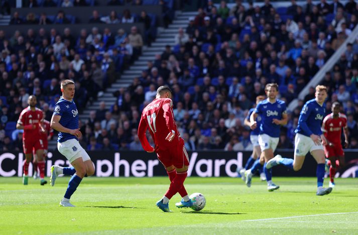 Virgil Van Dijk stangaði boltann í netið í uppbótartíma og tryggði Liverpool 1-2 sigur í nágrannaslag gegn Everton í 32. umferð ensku úrvalsdeildarinnar. Sigurinn var gríðarmikilvægur fyrir Liverpool í baráttunni um Meistaradeildarsæti en setur Everton á sama tíma í verri stöðu í þeirri baráttu. Liverpool er nú með 55 stig í 5. sæti en Everton er með 47 stig í 10. sætinu. Fyrsti nágrannaslagurinn á nýjum heimavelli Þetta var fyrsti nágrannaslagur liðanna á nýja heimavelli Everton og heimamenn voru í miklu stuði í upphafi leiks. Eftir tæplega hálftíma leik kom Iliman Ndiaye boltanum í netið en markið var dæmt af vegna rangstöðu. Eins og það hafi ekki verið nógu svekkjandi fyrir Everton þá skoraði Liverpool nánast í næstu sókn. Mohamed Salah braut ísinn fyrir gestina tæpum tveimur mínútum síðar, með góðri afgreiðslu eftir glæsilega stoðsendingu frá Cody Gakpo. Salah þurfti bara að leggja boltann í netið eftir frábæra sendingu frá Cody Gakpo. Molly Darlington/Getty Images Everton róaði sig mikið niður í sóknarleiknum eftir það en náði andanum aftur upp í seinni hálfleik og jafnaði metin á 54 mínútu. Beto skoraði jöfnunarmarkið en þetta var hans fjórða mark í síðustu þremur leikjum. Liverpool varð fyrir líka tvöföldu áfalli því markmaðurinn Giorgi Mamardashvili fór meiddur af velli strax eftir markið. Beto skoraði jöfnunarmarkið og Mamardashvili meiddist í leiðinni. Molly Darlington/Getty Images Bæði lið reyndu að finna sigurmarkið það sem eftir lifði leiks en það var Liverpool, á tíundu mínútu uppbótartímans, sem tókst að tryggja sigurinn. Liverpool sendi nánast alla sína leikmenn fram og fyrirliðinn Virgil Van Dijk skoraði markið mikilvæga með góðum skalla eftir hornspyrnu frá Dominik Szoboszlai.