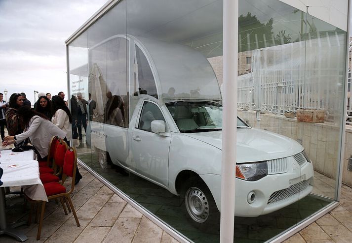 „Það var einlæg ósk hins heilaga föður að geta gert eitthvað fyrir börnin á Gasa,“ segir Anders Arborelius, kardínáli frá Svíþjóð, náinn trúnaðarvinur hins látna páfa og að þetta sé tákn vonar. Þetta kemur fram í frétt sem breski fjölmiðillinn BBC birti í dag. Gæti meðhöndlað á annan tug barna á dag Þar er einnig sagt frá því að hinn þekkti páfabíll, sem páfinn veifaði úr til þúsunda palestínskra kristinna manna í ferð sinni til Landsins helga árið 2014, hafi síðan verið til sýnis fyrir utan ísbúð í eigu kirkjunnar í Betlehem á hernumda Vesturbakkanum. „Í nóvember síðastliðnum var mér sýndur nýuppgerður bíllinn, búinn til áfallahjálpar og bólusetninga, og mér sagt að hann gæti meðhöndlað allt að 200 börn á dag. Í dag stendur hann þó enn í glerkassa á sama stað,“ skrifar Yolande Knell blaðamaður BBC. Bíllinn stendur enn óhreyfður í glerkassanum sínum.Getty Staðbundin deild alþjóðlegu kaþólsku hjálparsamtakanna Caritas sá um vinnuna við páfabílinn fyrir verkefnið „Vonarfarartækið“ og ætlaði að senda farartækið til Gasa. Í desember var það síðan sett á lista yfir 37 erlend frjáls félagasamtök sem ísraelsk yfirvöld skipuðu að hætta starfsemi. Varðandi Vonarfarartækið sagði talsmaður Caritas á staðnum við BBC að samtökin væru „í viðræðum við yfirvöld“ og að leyfi fyrir breytta páfabílnum væri í vinnslu í gegnum kirkjuna. Frans var ötull talsmaður þess að dauðarefsingar yrðu aflagðar, jók sýnileika kvenna innan kaþólsku kirkjunnar og hvatti fulltrúa hennar til að sýna hinsegin fólki virðingu.Getty Í yfirlýsingu sagði Cogat, varnarmálastofnun Ísraels sem stjórnar landamærastöðvunum til Gaza, að hún hefði séð um að tvær færanlegar heilsugæslustöðvar yrðu sendar af latneska patríarkadæminu í febrúar og væri „ekki kunnugt um neina beiðni um að koma með fleiri farartæki inn á svæðið.“ Þar var bætt við „ef formleg beiðni verði lögð fram í gegnum viðurkenndar leiðir, verði hún skoðuð í samræmi við það“. Hefur ekkert með stjórnmál að gera Tveggja ára átök á Gaza hafa veikt heilbrigðiskerfi Gaza verulega. Samkvæmt Alþjóðaheilbrigðismálastofnuninni (WHO) er aðeins helmingur allra sjúkrahúsa starfhæfur að hluta og sérhæfð læknisþjónusta er að mestu ófáanleg. Frá því að vopnahlé tók gildi í október hefur gengið hægt að gera við skemmdar heilbrigðisstofnanir og auka lækningabirgðir og þjónustu. WHO segir að um 18.500 manns, þar af 4.000 börn, séu á biðlistum eftir flutningi á sjúkrahús, í mörgum tilfellum vegna lífsnauðsynlegrar meðferðar. Arborelius kardínáli vonast til þess að leyfi verði brátt veitt fyrir því að breytti páfabíllinn fari inn á Gaza. „Þetta er eingöngu mannúðaraðgerð, hún hefur ekkert með stjórnmál að gera,“ segir hann og bætir við að það hafi verið ósk hins látna páfa „að skapa góð samskipti milli allra þjóða, allra trúarbragða, og sérstaklega í þágu barna sem búa við mjög, mjög erfiðar aðstæður“. Blessaði fólk á torginu daginn fyrir andlátið Frans páfi, fæddur sem Jorge Mario Bergoglio, var 88 ára að aldri þegar hann lést en hann fékk heilablóðfall sem leiddi til þess að hann fór í hjartastopp. Hann hafði lengi verið heilsuveill vegna alvarlegra veikinda í lungum og hafði stuttu fyrir andlát sitt varið þrjátíu og átta dögum á spítala vegna lungnabólgu í báðum lungum. Degi fyrir andlátið eða á sjálfan páskadag blessaði hann margmennið sem saman hafði komið á Péturstorgi til að fagna upprisunni. Hann hélt ekki messu af svölunum líkt og hefð er fyrir vegna veikinda heldur gerði það Angelo Comastri kardínáli í hans stað. Kardínálar kaþólsku kirkjunnar kusu sér nýjan páfa í byrjun maí en hann er sá 267. í röðinni. Bandaríkjamaðurinn Robert Francis Prevost varð fyrir valinu og valdi sér páfanafnið Leó. Hann er fjórtándi páfinn til að kjósa sér það nafn, og gengur því undir nafninu Leó fjórtándi.