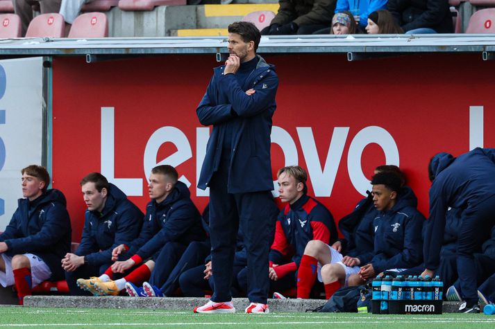 Valur tyllti sér í þriðja sæti Bestu deildar karla með því að vinna öruggan sigur á FH, 3:0, í þriðju umferð deildarinnar á N1 vellinum á Hlíðarenda í kvöld. Öll þrjú mörkin komu í fyrri hálfleik og er Valur nú með sex stig. FH er í 11. og næstneðsta sæti með aðeins eitt stig. Valur hóf leikinn af gífurlegum krafti og var kominn tveimur mörkum yfir eftir aðeins 14 mínútna leik. Adam Ægir Pálsson braut ísinn með glæsilegu marki á níundu mínútu. Þá þrumaði hann boltanum fyrir utan vítateig hægra megin og boltinn söng í nærhorninu. Fimm mínútum síðar tvöfaldaði Hörður Ingi Gunnarsson forystu Vals. Hann skoraði þá með skalla af stuttu færi á fjærstönginni eftir hornspyrnu Tryggva Hrafns Haraldssonar frá vinstri. Á 37. mínútu skoraði Hólmar Örn Eyjólfsson þriðja markið. Myles Veldman tók þá stutta hornspyrnu frá hægri á Tryggva Hrafn sem gaf fyrir á fjærstöngina þar sem Hólmar Örn skallaði í netið af stuttu færi. Staðan í hálfleik var því 3-0, Völsurum í vil, og hefði munurinn hæglega getað verið meiri enda óðu heimamenn hreinlega í færum. Síðari hálfleikur var töluvert rólegri og fátt um færi. FH færði sig aðeins upp á skaftið en skapaði sér ekki mörg almennileg færi. Lauk leiknum því með þriggja marka sigri Vals. Atvik leiksins Hjá mér voru það tveir tapaðir boltar sem enduðu á þaki stúkunnar með stuttu millibili. Stjörnur og skúrkar Adam Ægir Pálsson og Hörður Ingi Gunnarsson voru með fyrstu tvö mörk Valsmanna. Tryggvi Haraldsson var svo með tvær stoðsendingar. Arngrímur Bjartur Guðmundsson leikmaður FH er með þriðja markið skráð á sig sem sjálfsmark. Skiptar skoðanir eru á því hvort um sjálfsmark hafi verið að ræða eða hvort Hólmar Örn Eyjólfsson, leikmaður Vals, eigi það. Stemning og umgjörð Fín mæting á Hlíðarenda og fínasta stemning á þessum fallega fyrsta sumardegi. Dómarar Vilhjálmur Alvar Þórarinsson var á flautunni í kvöld, með honum voru Gylfi Már Sigurðsson og Ragnar Þór Bender. Vilhjálmur var með góð tök á leiknum en eina vafamálið er hendi sem FH-ingar vildu fá í fyrri hálfleik. Viðtöl Hermann Hreiðarsson: „Við kláruðum leikinn í rauninni í fyrri hálfleik“ Hemmi Hreiðars slakur á hliðarlínunni.Guðmundur Þórlaugarson „Þetta var besti leikurinn okkar á tímabilinu og fyrri hálfleikurinn sérstaklega. Stórkostlegir strákarnir allir sem einn, vinnuframlagið og baráttan. Það sást inni í klefa fyrir leik að það glimpaði í augunum á mönnum. Það var hungur í okkur og við ætlum að stimpla okkur að alvöru inn í þetta mót.“ Voru þið búnir að lesa FH-ingana? „Við skoðum auðvitað alltaf andstæðinginn og þeir eru auðvitað með ungt lið og svona. Planið var að keyra á þá alveg í botn frá fyrstu mínútu og það hjálpaði okkur svolítið hvað þeir voru aggressívir í pressunni þannig það mynduðust nóg af svæðum. Við fengum þá araglú af færum og spiluðum hrikalega vel allir sem einn.“ „Við kláruðum leikinn í rauninni í fyrri hálfleik og við lögðum þá aðeins meiri áherslu á að halda hreinu og klára leikinn með stæl. Það hefur verið stígandi í okkur en við eigum ennþá eftir að toppa en þetta var frábært í dag.“ Jóhannes Karl Guðjónsson: „Ágætis próf fyrir okkur að fá svona rassskellingu“ Tryggvi Hrafn Haraldsson: „Eigum að ganga gjörsamlega frá þeim“