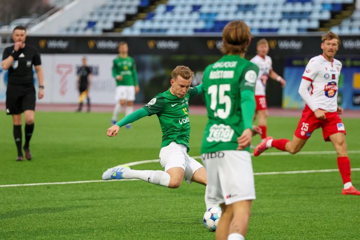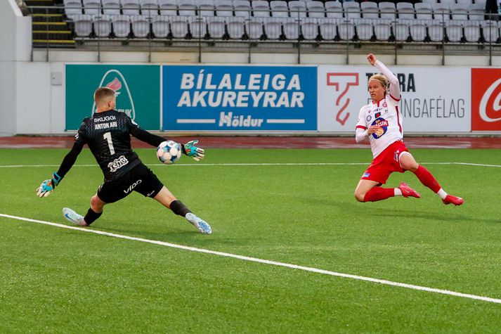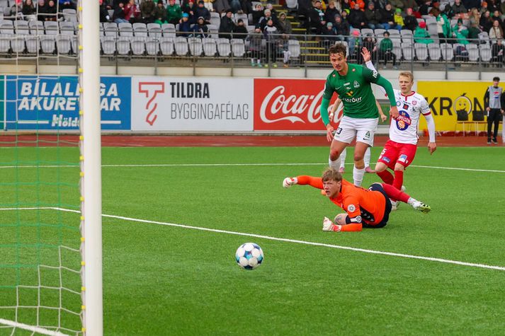 Breiðablik - Þór Ak. 4-0 | Sóknarleikur Blika vaknaði með látum Kolbeinn Kristinsson skrifar 27. apríl 2026 18:32 Breiðablik - Þór Besta Deild Karla Vor 2026 VÍSIR / DIEGO Breiðablik sigraði Þór 4-0 á Kópavogsvelli í kvöld í stórskemmtilegum leik sem innihélt allan pakkann, þ.e. flott mörk, stangar- og sláarskot, gul spjöld, tempó og ákefð. Kristófer Ingi Kristinsson, Anton Logi Lúðvíksson, Davíð Ingvarsson og Óli Valur Ómarsson skoruðu mörkin fyrir Breiðablik. Úrslitin þýða að Breiðablik fær stigin þrjú og átta samtals í töflunni á meðan Þór er áfram með sín sex stig nú þegar fjórum umferðum er lokið í Bestu deild karla. Frábær fyrri hálfleikur Leikurinn byrjaði fjörlega en Þór fékk fyrsta færi leiksins strax í upphafi en Anton Ari varði vel, eins og hann átti eftir að gera aftur síðar í hálfleiknum. Þór var í raun líklegra liðið fyrstu tíu mínútur leiksins eða svo en Breiðablik vann sig betur inn í leikinn eftir því sem leið á. Fínt flæði og tempó hjá báðum liðum og leikurinn var töluvert opinn. Kristófer Ingi braut ísinn fyrir Breiðablik á 20. mínútu eftir að hafa klárað færið sitt vel með skoti með hægri fæti úr teignum eftir góða sendingu frá Ágústi Orra. Kristófer Ingi skoraði fyrsta mark Breiðabliks. VÍSIR / DIEGO Sóknarleikur Blika var síður en svo stirður og Valgeir og Ágúst Orri voru t.a.m. virkilega sprækir á hægri vængnum í fyrri hálfleik en Valgeir þurfti svo að fara af velli í hálfleik eftir að hafa orðið fyrir hnjaski fyrr í leiknum. Þórsarar voru sömuleiðis öflugir og hefðu hæglega geta skorað eins og eitt mark ef ekki hefði verið fyrir landsliðsmarkvörðinn Anton Einar Blikar voru einu marki yfir þegar gengið var til búningsherbergja. Valgeir Valgeirsson ógnaði á vængnum. VÍSIR / DIEGO Meðvindur og mörk Síðari hálfleikurinn fór ögn hægar af stað en sá fyrri en það leið ekki á löngu þangað til Breiðablik var komið með mestöll völd á vellinum. Þór er hins vegar með kröftuga og hraða leikmenn í sínum röðum og Breiðablik gat ekki slakað á í eina sekúndu. Anton Logi Lúðvíksson kom inn á sem varamaður fyrir Kristin Steindórsson á 57. mínútu og stuttu síðar, eða á 64. mínútu, barst boltinn djúpt inn í teig Þórsara í kjölfar hornspyrnu þar sem Anton Logi var réttur maður á réttum stað og kom sínu liði í 2-0 forystu. Á milli næstu marka leiksins varði Anton Ari svakalega vel einn á móti einum gegn Atla Sigurjónssyni í slána og í horn. Upp úr hornspyrnunni skoraði Þór en Vilhjálmur Alvar dómari leiksins dæmdi brot í aðdragandanum og markið stóð því ekki. Þórsarar voru ekki par sáttir en Blikar gátu andað léttar. Anton Ari varði frá Atla úr algjöru dauðafæri. VÍSIR / DIEGO Davíð Ingvarsson gerði út um leikinn í kjölfarið endanlega er hann skoraði með skalla á 86. mínútu eftir að Óli Valur sendi fyrir frá hægri eftir að hafa komist upp að endamörkum. Davíð Ingvarsson skoraði skömmu síðar. VÍSIR / DIEGO Það var svo Óli Valur sjálfur sem innsiglaði sigurinn með fjórða marki kvöldsins í uppbótartíma. Stórskemmtilegur leikur á Kópavogsvelli í kvöld og einfaldlega góð auglýsing fyrir Bestu deild karla. Atvik leiksins Hvað má bjóða ykkur? Anton Ari og hans vörslur eru ofarlega á lista, markið sem var dæmt af Þórsurum í stöðunni 2-0 eða jafnvel fjórða mark leiksins en það var fyrsta mark Óla Vals í deildinni í alllangan tíma og hann kórónaði góðan leik hjá sér í kvöld með því. Stjörnur og skúrkar Margir sprækir hjá Blikum og sóknarleikurinn allur annar - en maður leiksins er að mati þess sem þetta ritar Anton Ari Einarsson. Hann átti tvær sturlaðar markvörslur í þessum leik. Þegar á reyndi þá stóð hann eins og klettur í markinu. Óli Valur, Kristófer Ingi og Ágúst Orri voru einnig sífellt ógnandi hjá Blikum. Aron Birkir sömuleiðis í markinu hjá Þór var flottur og kom í veg fyrir að sigurinn skyldi vera stærri. Dómarinn Prýðileg frammistaða í dag hjá Vilhjálmi Alvari og hans teymi. Þetta var ekki endilega einfaldur leikur að dæma, mikil bleyta og rok. Leikurinn fékk hins vegar að flæða ágætlega og stóru ákvarðanirnar virtust vera réttar og spjöldin sömuleiðis, frá fjölmiðlastúkunni séð alltént. Einkunn 8,5. Stemning og umgjörð Það var prýðileg mæting í Kópavoginn í kvöld og áhorfendur fengu virkilega skemmtilegan leik. Það var töluvert rok úti vitanlega en fallegt um að litast og umgjörðin flott, nú sem fyrr, í Kópavoginum. Gæðin eru svo sannarlega til staðar hjá okkur Ólafur Ingi Skúlason, þjálfari Breiðabliks, var ánægður með sóknarleik liðsins í 4-0 sigri á Þór eftir að hafa fengið gagnrýni í byrjun móts. „Ég hef ekki haft miklar áhyggjur af þessu, gæðin eru svo sannarlega til staðar hjá okkur. Við treystum því að þetta myndi koma, en það þarf auðvitað að gerast og það gleður okkur að það hafi gerst í dag,“ sagði Ólafur Ingi, en Blikar skoruðu fjögur mörk og fengu framlag frá mörgum leikmönnum. Hann hrósaði einnig markverði sínum, Antoni Ara, sem átti stórleik. „Hann er frábær markmaður. Hann ver mjög mikilvæglega fyrir okkur í byrjun leiks og svo aftur í stöðunni 2-0 þegar við töpum boltanum illa. Það hefði getað hleypt leiknum upp, en hann sá við því og var líka mjög góður í uppspilinu.“ Ólafur Ingi nefndi jafnframt breiddina í hópnum. „Það er gott að sjá leikmenn eins og Óla Val, Ágúst Orra, Kristófer Inga og fleiri leggja sitt af mörkum, og frábært að fá Aron Bjarnason sprækan inn.“ Næst mætir Breiðablik ÍBV í Vestmannaeyjum. „Við erum aðeins farin að skoða ferðalagið og líklega förum við á laugardegi frá Þorláks