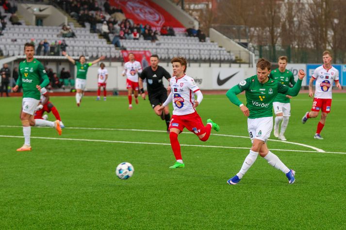 Breiðablik sigraði Þór 4-0 á Kópavogsvelli í kvöld í stórskemmtilegum leik sem innihélt allan pakkann, þ.e. flott mörk, stangar- og sláarskot, gul spjöld, tempó og ákefð. Kristófer Ingi Kristinsson, Anton Logi Lúðvíksson, Davíð Ingvarsson og Óli Valur Ómarsson skoruðu mörkin fyrir Breiðablik. Úrslitin þýða að Breiðablik fær stigin þrjú og átta samtals í töflunni á meðan Þór er áfram með sín sex stig nú þegar fjórum umferðum er lokið í Bestu deild karla. Frábær fyrri hálfleikur Leikurinn byrjaði fjörlega en Þór fékk fyrsta færi leiksins strax í upphafi en Anton Ari varði vel, eins og hann átti eftir að gera aftur síðar í hálfleiknum. Þór var í raun líklegra liðið fyrstu tíu mínútur leiksins eða svo en Breiðablik vann sig betur inn í leikinn eftir því sem leið á. Fínt flæði og tempó hjá báðum liðum og leikurinn var töluvert opinn. Kristófer Ingi braut ísinn fyrir Breiðablik á 20. mínútu eftir að hafa klárað færið sitt vel með skoti með hægri fæti úr teignum eftir góða sendingu frá Ágústi Orra. Kristófer Ingi skoraði fyrsta mark Breiðabliks. VÍSIR / DIEGO Sóknarleikur Blika var síður en svo stirður og Valgeir og Ágúst Orri voru t.a.m. virkilega sprækir á hægri vængnum í fyrri hálfleik en Valgeir þurfti svo að fara af velli í hálfleik eftir að hafa orðið fyrir hnjaski fyrr í leiknum. Þórsarar voru sömuleiðis öflugir og hefðu hæglega geta skorað eins og eitt mark ef ekki hefði verið fyrir landsliðsmarkvörðinn Anton Einar Blikar voru einu marki yfir þegar gengið var til búningsherbergja. Valgeir Valgeirsson ógnaði á vængnum. VÍSIR / DIEGO Meðvindur og mörk Síðari hálfleikurinn fór ögn hægar af stað en sá fyrri en það leið ekki á löngu þangað til Breiðablik var komið með mestöll völd á vellinum. Þór er hins vegar með kröftuga og hraða leikmenn í sínum röðum og Breiðablik gat ekki slakað á í eina sekúndu. Anton Logi Lúðvíksson kom inn á sem varamaður fyrir Kristin Steindórsson á 57. mínútu og stuttu síðar, eða á 64. mínútu, barst boltinn djúpt inn í teig Þórsara í kjölfar hornspyrnu þar sem Anton Logi var réttur maður á réttum stað og kom sínu liði í 2-0 forystu. Á milli næstu marka leiksins varði Anton Ari svakalega vel einn á móti einum gegn Atla Sigurjónssyni í slána og í horn. Upp úr hornspyrnunni skoraði Þór en Vilhjálmur Alvar dómari leiksins dæmdi brot í aðdragandanum og markið stóð því ekki. Þórsarar voru ekki par sáttir en Blikar gátu andað léttar. Anton Ari varði frá Atla úr algjöru dauðafæri. VÍSIR / DIEGO Davíð Ingvarsson gerði út um leikinn í kjölfarið endanlega er hann skoraði með skalla á 86. mínútu eftir að Óli Valur sendi fyrir frá hægri eftir að hafa komist upp að endamörkum. Davíð Ingvarsson skoraði skömmu síðar. VÍSIR / DIEGO Það var svo Óli Valur sjálfur sem innsiglaði sigurinn með fjórða marki kvöldsins í uppbótartíma. Stórskemmtilegur leikur á Kópavogsvelli í kvöld og einfaldlega góð auglýsing fyrir Bestu deild karla. Atvik leiksins Hvað má bjóða ykkur? Anton Ari og hans vörslur eru ofarlega á lista, markið sem var dæmt af Þórsurum í stöðunni 2-0 eða jafnvel fjórða mark leiksins en það var fyrsta mark Óla Vals í deildinni í alllangan tíma og hann kórónaði góðan leik hjá sér í kvöld með því. Stjörnur og skúrkar Margir sprækir hjá Blikum og sóknarleikurinn allur annar - en maður leiksins er að mati þess sem þetta ritar Anton Ari Einarsson. Hann átti tvær sturlaðar markvörslur í þessum leik. Þegar á reyndi þá stóð hann eins og klettur í markinu. Óli Valur, Kristófer Ingi og Ágúst Orri voru einnig sífellt ógnandi hjá Blikum. Aron Birkir sömuleiðis í markinu hjá Þór var flottur og kom í veg fyrir að sigurinn skyldi vera stærri. Dómarinn Prýðileg frammistaða í dag hjá Vilhjálmi Alvari og hans teymi. Þetta var ekki endilega einfaldur leikur að dæma, mikil bleyta og rok. Leikurinn fékk hins vegar að flæða ágætlega og stóru ákvarðanirnar virtust vera réttar og spjöldin sömuleiðis, frá fjölmiðlastúkunni séð alltént. Einkunn 8,5. Stemning og umgjörð Það var prýðileg mæting í Kópavoginn í kvöld og áhorfendur fengu virkilega skemmtilegan leik. Það var töluvert rok úti vitanlega en fallegt um að litast og umgjörðin flott, nú sem fyrr, í Kópavoginum. Gæðin eru svo sannarlega til staðar hjá okkur Ólafur Ingi Skúlason, þjálfari Breiðabliks, var ánægður með sóknarleik liðsins í 4-0 sigri á Þór eftir að hafa fengið gagnrýni í byrjun móts. „Ég hef ekki haft miklar áhyggjur af þessu, gæðin eru svo sannarlega til staðar hjá okkur. Við treystum því að þetta myndi koma, en það þarf auðvitað að gerast og það gleður okkur að það hafi gerst í dag,“ sagði Ólafur Ingi, en Blikar skoruðu fjögur mörk og fengu framlag frá mörgum leikmönnum. Hann hrósaði einnig markverði sínum, Antoni Ara, sem átti stórleik. „Hann er frábær markmaður. Hann ver mjög mikilvæglega fyrir okkur í byrjun leiks og svo aftur í stöðunni 2-0 þegar við töpum boltanum illa. Það hefði getað hleypt leiknum upp, en hann sá við því og var líka mjög góður í uppspilinu.“ Ólafur Ingi nefndi jafnframt breiddina í hópnum. „Það er gott að sjá leikmenn eins og Óla Val, Ágúst Orra, Kristófer Inga og fleiri leggja sitt af mörkum, og frábært að fá Aron Bjarnason sprækan inn.“ Næst mætir Breiðablik ÍBV í Vestmannaeyjum. „Við erum aðeins farin að skoða ferðalagið og líklega förum við á laugardegi frá Þorlákshöfn. Það er bara gott mál.“ Það var ákveðið reynsluleysi og einbeitingarleysi Sigurður Höskuldsson, þjálfari Þórs, var svekktur eftir 4-0 tap gegn Breiðabliki þrát