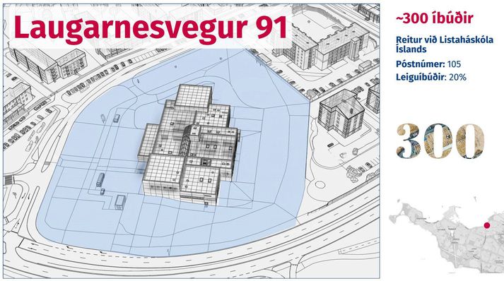 Í fréttatilkynningu þess efnis segir að íbúðirnar verði á eftirfarandi stöðum og áætlaður fjöldi þeirra sé: Borgartún: 220 íbúðir Grensásvegur: 90 íbúðir Efri hluta Laugavegar: 100 íbúðir Laugarnesvegur: 300 íbúðir Seljavegur: 90 íbúðir Á landi austan Korpúlfsstaða, á mörkum Reykjavíkur og Mosfellsbæjar: Á bilinu 400 til 600 íbúðir Alls séu íbúðirnar því um 1.200 til 1.400 talsins. Verkefnin séu mislangt á veg komin og íbúðum geti fjölgað enn frekar eftir því sem líður á skipulagsferlið. Kynningu ráðherranna og borgarstjóra má sjá í heild sinni hér: Hér má sjá glærusýningu sem sýnd var á fundinum en í henni má sjá ríkislóðirnar og húsnæðið sem um ræðir. Hér má sjá Vegagerðarreitinn svokallaða í Borgartúni.Stjórnarráðið Breyta skrifstofuhúsnæði í íbúðir Annars vegar verði þetta nýbyggingar og hins vegar umbreyting á húsnæði sem ríkið nýtti áður undir stofnanir og margvíslega aðra starfsemi. Tuttugu til þrjátíu prósent íbúðanna verði hagkvæmar íbúðir, það er almennar íbúðir og íbúðir sem uppfylla skilyrði hlutdeildarlána, aðrar leiguíbúðir, til dæmis stúdentaíbúðir, leiguíbúðir Félagsbústaða og íbúðir fyrir eldra fólk og búseturéttaríbúðir. Önnur sveitarfélög næsta skrefið Á næstunni verði verkefnin auglýst og þá gefist uppbyggingaraðilum kostur á að sækja um að taka þátt í þeim. Í framhaldinu verði lóðirnar og eignirnar seldar til þeirra sem verða fyrir valinu og verkefnin fari svo áfram í frekara skipulagsferli. Næsta skref sé að vinna markvisst að uppbyggingu á ríkislóðum og ríkiseignum í fleiri sveitarfélögum. Nýju íbúðirnar á ríkisreitunum séu kjölfestan í öðrum húsnæðispakka ríkisstjórnarinnar. Styðja við leigjendur og fyrstu kaupendur „Ég er uppalinn í Breiðholtinu og þegar uppbygging hófst þar á sínum tíma voru kynnt áform um að reisa 1.250 íbúðir. Hér erum við með 1.200 til 1.400 íbúðir og uppbyggingu af stærðargráðu sem munar um. Við erum að koma inn á markaðinn með lóðir sem hefur sárlega vantað því við verðum að byggja meira. Um leið erum við að jafna leikinn og styðja bæði við leigjendur og fyrstu kaupendur. Í ofanálag erum við að setja rækilega á dagskrá að breyta atvinnuhúsnæði í hentugar og góðar íbúðir. Við gerum þetta í góðu samstarfi við Reykjavíkurborg og samvinnan sýnir hversu miklu stjórnvöld geta áorkað þegar þau taka höndum saman,“ er haft eftir Ragnari Þór Ingólfssyni, félags og húsnæðismálaráðherra. Haft er eftir Daða Má Kristóferssyni, fjármála- og efnahagsráðherra, að mikilvægt sé að tryggja að þróunarreitir ríkisins séu nýttir til uppbyggingar. Það hafi verið kyrrstaða í þessum málum sem hafi valdið því að uppbygging hafi ekki verið jafnhröð og ákjósanlegt hefði verið. „Við einsettum okkur að bæta samskipti ríkisins og sveitarfélaga. Þetta er enn eitt dæmi um árangurinn af því. Með þessum samningnum fjölgum við íbúðum í borginni, bæði með umbreytingu á eldra húsnæði í eigu ríkisins og betri nýtingu lóða.“ Íbúðir verða byggðar í kringum húsnæði Listaháskóla Íslands í Laugarnesi.Stjórnarráðið Loks er haft eftir Heiðu Björgu Hilmisdóttur borgarstjóra að þessir samningar sýni hverju sé hægt að áorka þegar ríki og borg vinna saman af alvöru að húsnæðismálum. „Við í meirihlutanum í borginni höfum lagt áherslu á fjölbreytt framboð húsnæðis, hraðari uppbyggingu og að nýta það landrými sem fyrir hendi er, í samræmi við húsnæðisáætlun Reykjavíkurborgar. Hér erum við að leggja drög að yfir þúsund nýjum heimilum fyrir íbúa og tryggja um leið að hluti þeirra verði hagkvæmar íbúðir fyrir þá íbúa sem þurfa á því að halda. Þetta samstarf skilar fleiri heimilum , sterkara samfélagi og öflugri húsnæðismarkaði.“