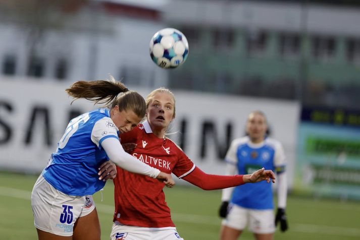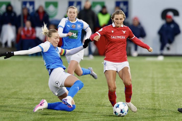 Stjarnan og Valur áttust við í annarri umferð Bestu deildar kvenna á Samsung-vellinum í kvöld. Stjarnan var sterkari aðilinn allan leikinn og uppskar verðskuldaðan sigur. Birna Jóhannsdóttir skoraði fyrra mark Stjörnunnar en Jana Sól Valdimarsdóttir það síðara. Lokastaðan 2-0. Fyrir leik náði undirritaður tali af þjálfurum liðanna. Óskar Smári sagði aðspurður að hans stelpur væru reynslumeiri og hann ætlaðist til þess að þær nýttu reynsluna á móti ungu liði Vals. Leikurinn hófst með mikilli baráttu Stjörnunnar. Þær þjörmuðu af varnarlínu Vals strax frá fyrstu mínútu og pressuðu hátt. Tinna Brá Magnúsdóttir markmaður fékk nóg að gera strax í upphafi. Stjarnan sótti og sótti en færin voru bitlaus. Augun á boltanum.VÍSIR/VILHELM Valsstelpur komust í sitt fyrsta færi eftir um það bil korters leik en það færi var slakt. Við þetta róaðist aðeins spilamennska Vals og nokkrum mínútum síðar komst Arnfríður Auður í ágætis færi. Boltinn skoppaði fyrir framan vítateiginn og þar var Arnfríður vel staðsett. Hún lét vaða á markið en Bridgette Skiba sá við henni. Stjarnan hélt áfram að pressa á Val. Birna Jóhannsdóttir barðist eins og ljón og mundaði skotfótinn stuttu síðar og reyndi að skrúfa knöttinn uppi í fjærhornið. Miðið var ögn skakkt og fór boltinn fram hjá. Anna María Baldursdóttir og Nadía Atladóttir í baráttunni í kvöld.VÍSIR/VILHELM Valsvörnin gerði vel í að þrýsta sóknarsveit Stjörnunnar út úr vítateignum og heimakonur þurftu að treysta á langskot. Þau voru ekki að hitta á rammann og sköpuðu því lítinn usla. Andrea Mist Pálsdóttir fékk ágætis færi á 33.mínútu. Þessi öflugi spyrnumaður bjó sér til pláss og náði að hamra á markið en Tinna Brá var vel á verði í markinu. Valsstelpur voru hræddar við að halda boltanum og voru lítið að ógna. Á 36.mínútu kom hættulegasta færi fyrri hálfleiksins. Stjarnan lét boltann rúlla vel á milli sín úti á vinstri vængnum. Úlfa Dís sendi boltann inn í teig og þar var Snædís María Jörundsdóttir vel staðsett. Hún lét vaða á markið í fyrstu snertingu og þurfti Tinna Brá að taka á honum stóra sínum. Tinna henti í gamaldags handbolta markvörslu með fótunum. Við þetta sóttu Stjarnan enn meira í sig veðrið en inn fór boltinn ekki. Staðan í hálfleik var 0-0 og gátu Valsarar prísað sig sælar með að hafa ekki fengið á sig mark. Það var ansi fámennt en góðmennt í stúkunni.VÍSIR/VILHELM Matthías Guðmundsson þjálfari Vals gerði breytingu í hálfleik. Nadía Atladóttir kom inn á fyrir Sigrúnu Ísfold Valsdóttur. Matthías hefur viljað fá meiri krydd í sóknarleikinn og hrista aðeins upp í þessu. Valur kom beittari til leiks í síðari hálfleik. Á 60.mínútu áttu Stjörnustelpur enn eina hornspyrnuna. Andrea Mist Pálsdóttir spyrnti inn í teig og hitti þar kollinn á Önnu Maríu Baldursdóttur. Anna María á fínan skalla en Valur bjargar á marklínu, boltinn skoppar út og beint fyrir fætur Birnu Jóhannsdóttur. Birna þrumaði á markið og loks hittu þær netmöskvana. Staðan orðin 1-0. Valsstelpur urðu smeykar við markið en Stjarnan varð enn beittari. Á 90.mínútu skoraði Jana Sól Valdimarsdóttir annað mark Stjörnunnar. Birna Jóhannsdóttir vann skallaeinvígi á miðjum velli og flikkaði boltann á Murielle, hún flikkaði enn lengra og beint fyrir fæturnar á Jönu Sól. Jana slúttaði vel án þess að hika. Virkilega flott mark. Lokastaðan 2-0 og áttu Stjarnan sigurinn skilið. Þær voru betri aðilinn og hefðu getað skorað enn fleiri mörk. Atvik leiksins Þolinmæði þrautir vinnur allar. Atvik leiksins var mark Birnu Jóhannsdóttur. Stjarnan hafði sótt látlaust en inn ætlaði boltinn ekki. Birna sótti markið með eljuna að vopni, hún var vel staðsett og spyrnti af krafti. Loksins brotnaði ísinn. Stjörnur og skúrkar Tinna Brá Magnúsdóttir markmaður Vals fékk nóg að gera og var stjarna leiksins. Stjarnan skaut og skaut á hana en Tinna sá við þeim. Hún átti flottar skutlur og varði í tvígang með fótunum. Birna Jóhannsdóttir á líka skilið stjörnustimpil. Hún barðist vel fyrir liðið og var óhrædd við að lúðra á markið. Skúrkar kvöldsins voru engir. Dómararnir Atli Björn Levy var á flautunni í kvöld og aðstoðarmenn hans voru þeir Óliver Thanh Tung Vú og Patryk Emanuel Jurczak. Atli Björn lét leikinn rúlla vel og var ekkert að stoppa spilið af óþörfu. Hann og hans sveit eiga hrós skilið fyrir þeirra frammistöðu. Stemmning og umgjörð Íþróttaþyrstir Garðbæingar þurftu að velja af hlaðborði kappleikja því þetta var annasamur dagur fyrir íþróttirnar í bænum. Stjörnustelpur voru að leika á sama tíma á móti Gróttu í umspili um sæti í Olísdeild kvenna í handbolta. Karlalið félagsins var svo að leika í Skagafirði á móti Tindastóli í úrslitakeppni Bónus-deildarinnar í körfubolta. Það var því keppst um hylli Stjörnufólks. Stjarnan bauð upp á grillaða hamborgara af Dúllubar og eiga hrós skilið fyrir umgjörðina. Matthías Guðmundsson varð að sætta sig við tap.VÍSIR/VILHELM Matthías: Ef þær spila með þessa orku þá koma fullt af góðum úrslitum Matthías Guðmundsson þjálfari Vals var sáttur með orkustigið hjá sínu liði í viðtali eftir. Aðspurður sagði hann: „Mér fannst einkenna leikinn að það var mikil orka. Það var mikill munur á fyrri og seinni hálfleik. Fyrri hálfleikurinn var erfiðari fyrir okkur og fannst okkur það öllum inn í klefa. Við ræddum í hálfleik að við gætum verið rólegri og náð að spila okkar bolta“. Hann sagði að hann hafi verið ánægður með stelpurnar í seinni hálfleik. „Mér fannst við ná betri tökum á spilamennskunni mjög snemma í seinni hálfleik og hei