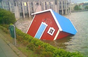 Húsið Atlantis farið úr Tjörninni Húsið, sem verið hefur í Tjörninni í Reykjavík undanfarnar vikur, er nú á bak og burt eftir að það losnaði í ofsaveðri og rak yfir alla Tjörnina. 4.6.2008 14:10