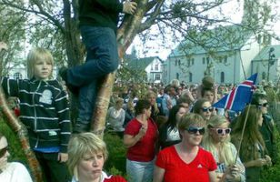 Sigurhátíðin hafin Sigurhátíð til heiðurs Jóhönnu Guðrúnu og föruneyti er hafin með pompi og prakt á Austurvelli. Mörg hundruð manns eru mætt til þess að fylgjast með. 17.5.2009 17:35