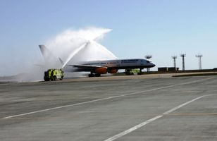 Moskvufarar lentir - slökkviliðið sprautaði vatni yfir flugvélina Evróvisjón-fararnir lentu um þrjú leitið. Þegar flugvélin var lent ók slökkviliðið á flugvellinum að vélinni og sprautaði vatni yfir hana þeim til heiðurs. 17.5.2009 15:43