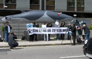 Uppblásin hrefna fyrir utan sendiráðið í London Mótmælendur tóku sér stöðu við íslenska sendiráðið í London í dag til þess að mótmæla hvalveiðum Íslendinga en veiðar hefjast að nýju í dag. Þeir tóku með sér stóra uppblásna hrefnu auk þess sem kynnt var ný skoðanakönnun sem sýnir að 82 prósent Breta eru andsnúnir hvalveiðum Íslendinga. 26.5.2009 13:36