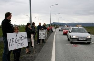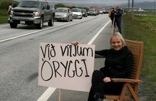Mótmæli á Kjalarnesi - myndir Kjalnesingar, sem eru orðnir langeygir eftir úrbótum í umferðarmálum, gripu til sinna ráða síðdegis. Þeir hægðu á umferðinni út úr borginni til að undirstrika kröfur sínar. 12.6.2009 20:34