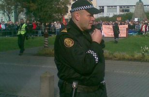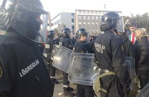 Þingmenn fara bakdyramegin inn í þinghúsið Lögreglumenn á Austurvelli brýna það fyrir mótmælendum að halda sig innan þeirra marka sem þeim hefur verið sett. Geri þeir það ekki muni lögreglumenn beita piparúða. 1.10.2010 14:07