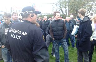 Hrópa að Alþingi: „Út með ruslið!“ Á annað þúsund manns eru við mótmælastöðu fyrir utan Alþingi þar sem þingfundur var settur fyrir stundu. Mótmælin fara að mestu friðsamlega fram. 1.10.2010 14:11