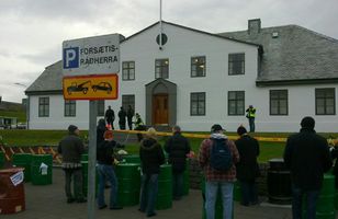 Fámenn og friðsæl mótmæli Rúmlega tuttugu manns standa við tunnur fyrir utan Stjórnarráðshúsið og mótmæla. Lögreglan er með nokkurn viðbúnað eftir að skemmdarverk voru unnin á húsinu í nótt af ölvuðum manni. 12.10.2010 10:14