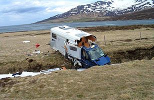 Húsbíll tókst á loft og endaði í skurði Hjónin Vilhelm Guðbjartsson og Guðrún Ragnarsdóttir lentu í kröppum dansi á dögunum þegar þau óku milli Hofsóss og Siglufjarðar. Húsbíll þeirra tók á sig vindhviðu og valt að minnsta kosti tvær veltur út af veginum áður en hann staðnæmdist í skurði undir vegbrúninni. 27.6.2012 04:45