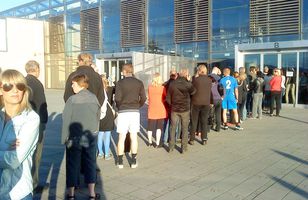 Langar raðir á kjörstað í kvöld Nú klukkan hálf tíu í kvöld voru langar raðir fyrir utan Laugardalshöllina af fólki sem ætlaði að greiða atkvæði fyrir forsetakosningarnar utan kjörfundar. 28.6.2012 22:53