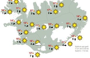 Dýrðlegt veður í dag Veðrið á Íslandi er í einu orði sagt dýrðlegt í dag, hvert sem farið er. Eins og meðfylgjandi mynd ber með sér var víðast heiðskírt í hádeginu. Helga Ívarsdóttir veðurfræðingur segir þó að það sé örlítið skýjað fyrir austan, aðeins við Eyjafjörðinn og við Höfn sé hálfskýjað. Veðurspáin fyrir næstu daga lítur vel út. "Við gefum út spá fram á þriðjudag og það er í raun og veru bara mjög fín spá, hæglætisveður og hlýtt í veðri,“ segir Helga. Hún segir að hugsanlega verði fólk vart við einstaka dropa á stöku stað en það verði minniháttar. Víðast hvar verði bjart. 11.7.2012 14:40