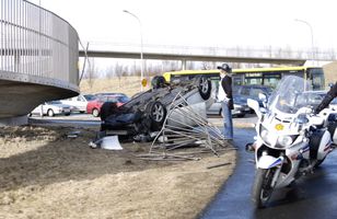 Bílvelta við Hringbraut Tveir voru fluttir á slysadeild fyrir stuttu eftir að bíll þeirra valt við göngubrúna yfir Hringbraut í miðborginni. 22.3.2015 16:41