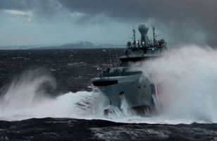 Með flutningaskip í togi Varðskipið Þór er með flutningaskipið Hauk í togi í um sex metra ölduhæð. 4.4.2015 17:37