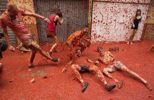 Gestir Tómathátíðarinnar á Spáni máluðu bæinn rauðan Hápunktur Tomatina-hátíðarinnar var þegar gestir köstuðu gríðarlegu magni af ofþroskuðum tómötum hverjir í aðra. 30.8.2017 14:53