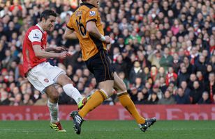 Van Persie með tvö í sigri Arsenal - Wigan náði jafntefli á Anfield Robin van Persie skoraði bæði mörk Arsenal í 2-0 sigri á Úlfunum á Emirates í ensku úrvalsdeildinni í dag og minnkaði Arsenal því forskot Manchester United á toppnum aftur niður í fjögur stig. Wigan náði jafntefli á móti Liverpool á Anfield og West Ham náði stigi þrátt fyrir að hafa lent 3-0 undir. 12.2.2011 17:02
