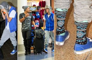 Flottir sokkar Bieber Kanadíski söngvarinn Justin Bieber, 17 ára, var klæddur í munstraða háa sokka í gær þegar hann gekk í gegnum LAX flugvöllinn. Justin reyndi að flýja nærstadda ljósmyndara og hylja andlit sitt eins og sjá má á myndunum... 23.1.2012 11:15